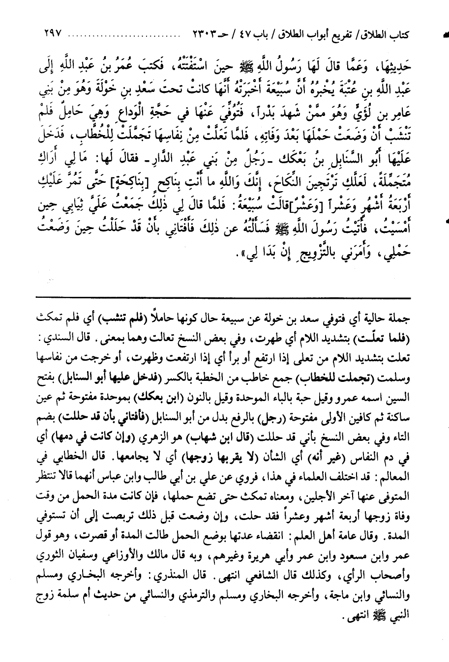 قَالَ السِّنْدِيُّ تَعَلَّتْ بِتَشْدِيدِ اللَّامِ مِنْ تعلى إذا ارتفع أو برأ أَيْ إِذَا ارْتَفَعَتْ وَطَهُرَتْ أَوْ خَرَجَتْ مِنْ نِفَاسِهَا وَسَلِمَتْ (تَجَمَّلَتْ لِلْخُطَّابِ) جَمْعُ خَاطِبٍ مِنَ الْخِطْبَةِ بَالْكَسْرِ (فَدَخَلَ عَلَيْهَا أَبُو السَّنَابِلِ) بِفَتْحِ السِّينِ اسْمُهُ عَمْرٌو وَقِيلَ حَبَّةُ بَالْبَاءِ الْمُوَحَّدَةِ وقيل بالنون (بن بَعْكَكٍ) بِمُوَحَّدَةٍ مَفْتُوحَةٍ ثُمَّ عَيْنٍ سَاكِنَةٍ ثُمَّ كَافَيْنِ الْأُولَى مَفْتُوحَةٌ (رَجُلٌ) بَالرَّفْعِ بَدَلٌ مِنْ أبو السَّنَابِلِ (فَأَفْتَانِي بِأَنْ قَدْ حَلَلْتُ) بِضَمِّ التَّاءِ وَفِي بَعْضِ النُّسَخِ بِأَنِّي قَدْ حَلَلْتُ (قَالَ بن شِهَابٍ) هُوَ الزُّهْرِيُّ (وَإِنْ كَانَتْ فِي دَمِهَا) أَيْ فِي دَمِ النِّفَاسِ (غَيْرَ أَنَّهُ) أَيِ الشَّأْنُ (لَا يَقْرَبُهَا زَوْجُهَا) أَيْ لَا يُجَامِعُهَا