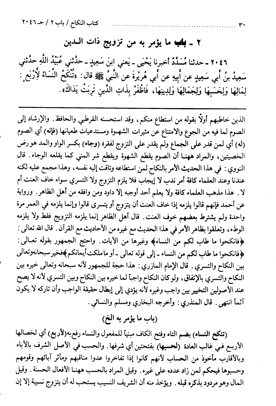 [2047] (تُنْكَحُ النِّسَاءُ) بِضَمِّ التَّاءِ وَفَتْحِ الْكَافِ مَبْنِيًّا لِلْمَفْعُولِ وَالنِّسَاءُ رُفِعَ بِهِ (لِأَرْبَعٍ) أَيْ لَخَصَّهَا لَهَا الْأَرْبَعُ فِي غَالِبِ الْعَادَةِ (لِحَسَبِهَا) بِفَتْحَتَيْنِ أَيْ شَرَفِهَا