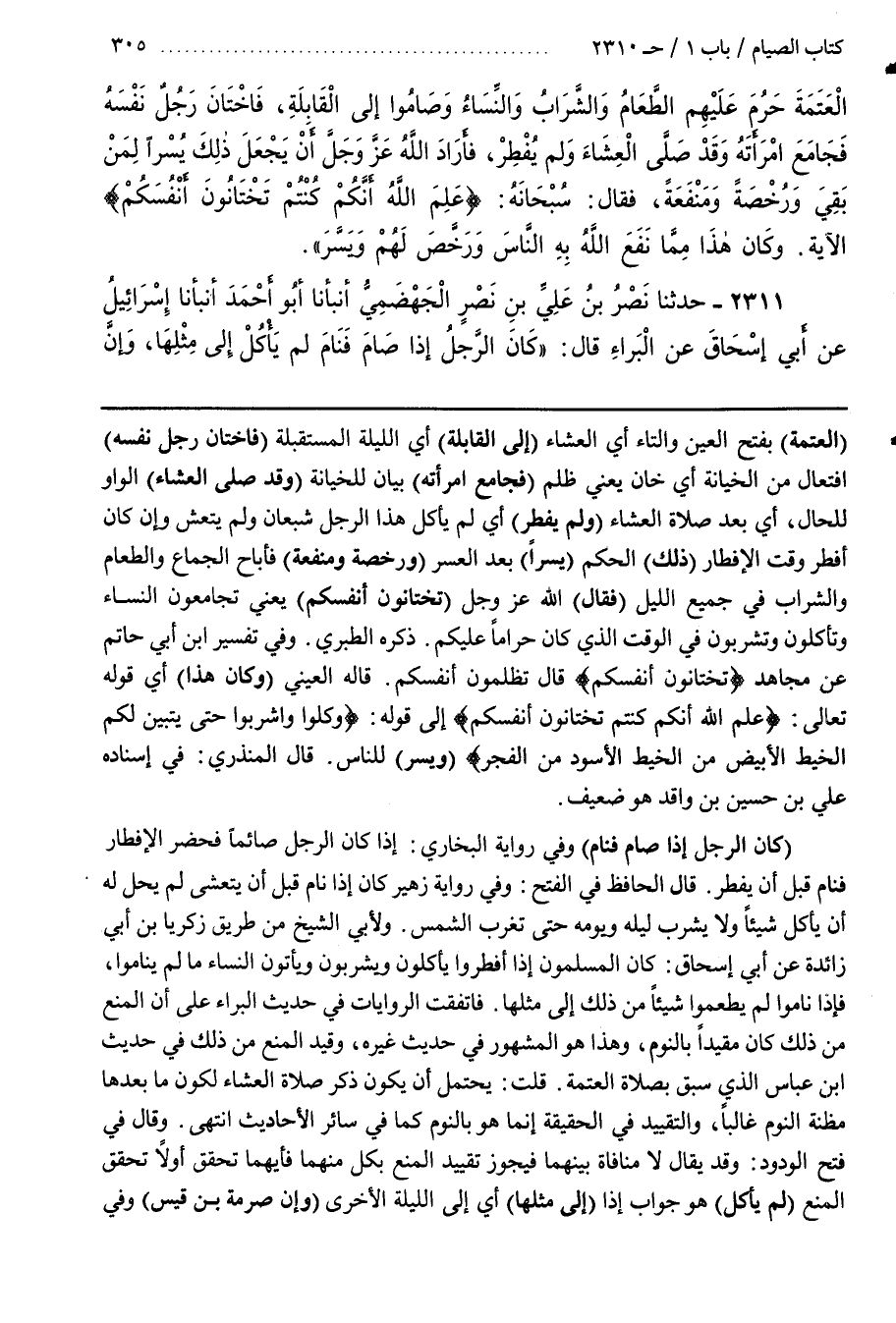وَلِأَبِي الشَّيْخِ مِنْ طَرِيقِ زَكَرِيَّا بْنُ أَبِي زَائِدَةَ عَنْ أَبِي إِسْحَاقَ كَانَ الْمُسْلِمُونَ إِذَا أَفْطَرُوا يَأْكُلُونَ وَيَشْرَبُونَ وَيَأْتُونَ النِّسَاءَ مَا لَمْ يَنَامُوا فَإِذَا نَامُوا لَمْ يَطْعَمُوا شَيْئًا مِنْ ذَلِكَ إِلَى مِثْلِهَا