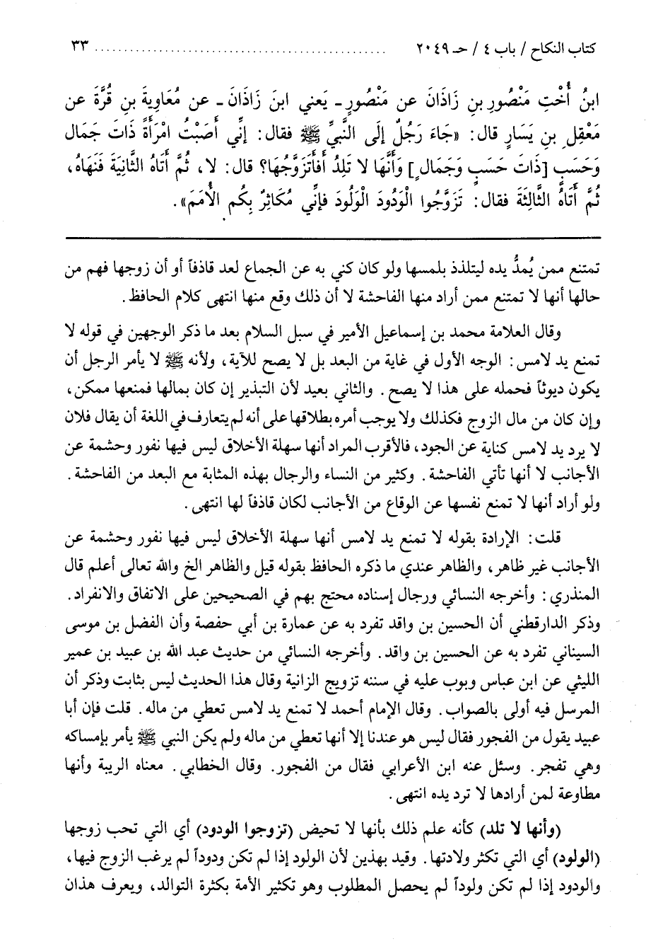 [2050] (وَأَنَّهَا لَا تَلِدُ) كَأَنَّهُ عَلِمَ بِذَلِكَ بِأَنَّهَا لَا تَحِيضُ (تَزَوَّجُوا الْوَدُودَ) أَيِ الَّتِي تُحِبُّ زَوْجَهَا (الْوَلُودَ) أَيِ الَّتِي تَكْثُرُ وِلَادَتُهَا