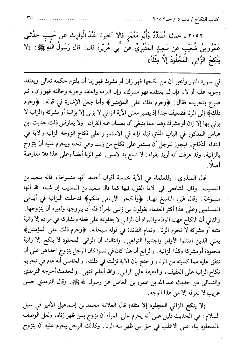 [2052] (لَا يَنْكِحُ الزَّانِي الْمَجْلُودُ إِلَّا مِثْلَهُ) قَالَ الْعَلَّامَةُ مُحَمَّدُ بْنُ إِسْمَاعِيلَ الْأَمِيرُ فِي سُبُلِ السَّلَامِ فِي الْحَدِيثِ دَلِيلٌ عَلَى أَنَّهُ يَحْرُمُ عَلَى الْمَرْأَةِ أَنْ تُزَوَّجَ بِمَنْ ظَهَرَ زِنَاهُ وَلَعَلَّ الْوَصْفَ بَالْمَجْلُودِ بِنَاءٌ عَلَى الْأَغْلَبِ في حق من ظهر منه الزنى