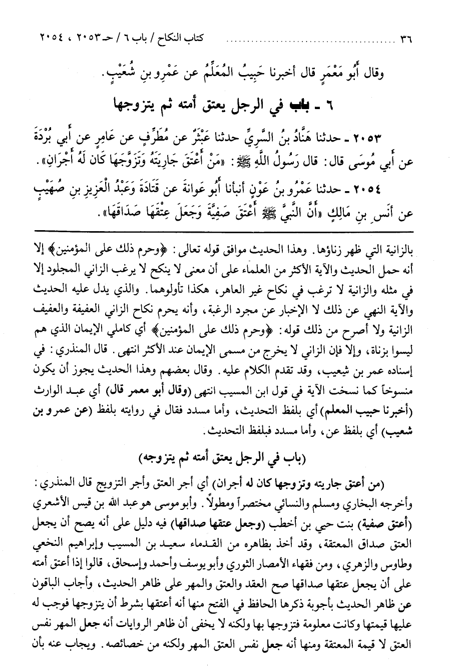 [2053] (مَنْ أَعْتَقَ جَارِيَتَهُ وَتَزَوَّجَهَا كَانَ لَهُ أَجْرَانِ) أَيْ أَجْرُ الْعِتْقِ وَأَجْرُ التَّزْوِيجِ قَالَ الْمُنْذِرِيُّ وَأَخْرَجَهُ الْبُخَارِيُّ وَمُسْلِمٌ وَالنَّسَائِيُّ مُخْتَصَرًا وَمُطَوَّلًا
