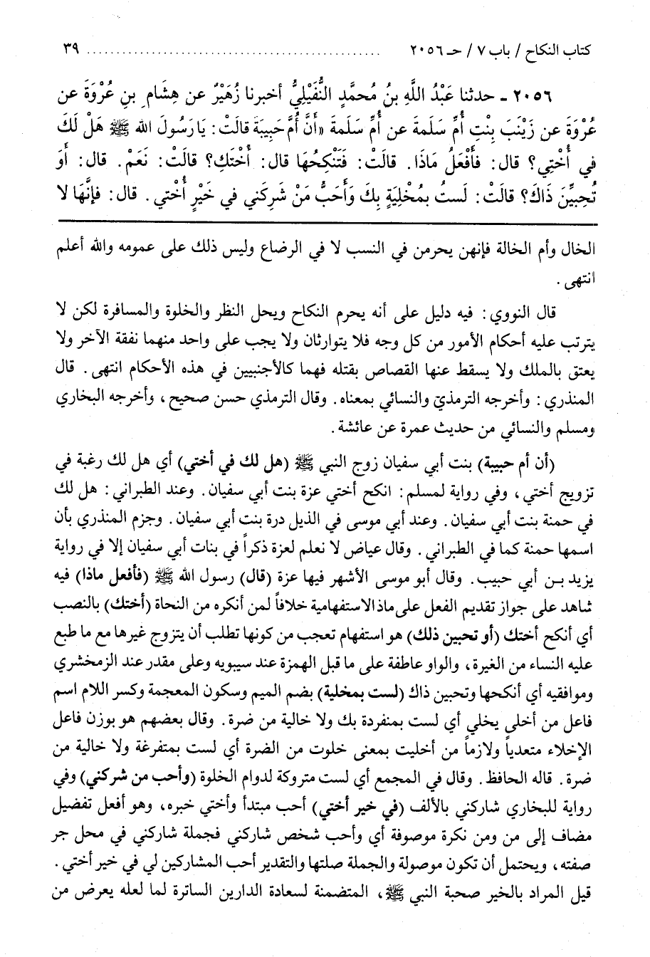 [2056] (أَنَّ أُمَّ حَبِيبَةَ) بِنْتَ أَبِي سُفْيَانَ زَوْجَ النَّبِيِّ صَلَّى اللَّهُ عَلَيْهِ وَسَلَّمَ (هَلْ لَكَ فِي أُخْتِي) أَيْ هَلْ لَكَ رَغْبَةٌ فِي تَزْوِيجِ أُخْتِي وَفِي رِوَايَةٍ لِمُسْلِمٍ أَنْكِحْ أُخْتِي عَزَّةَ بِنْتَ أَبِي سُفْيَانَ