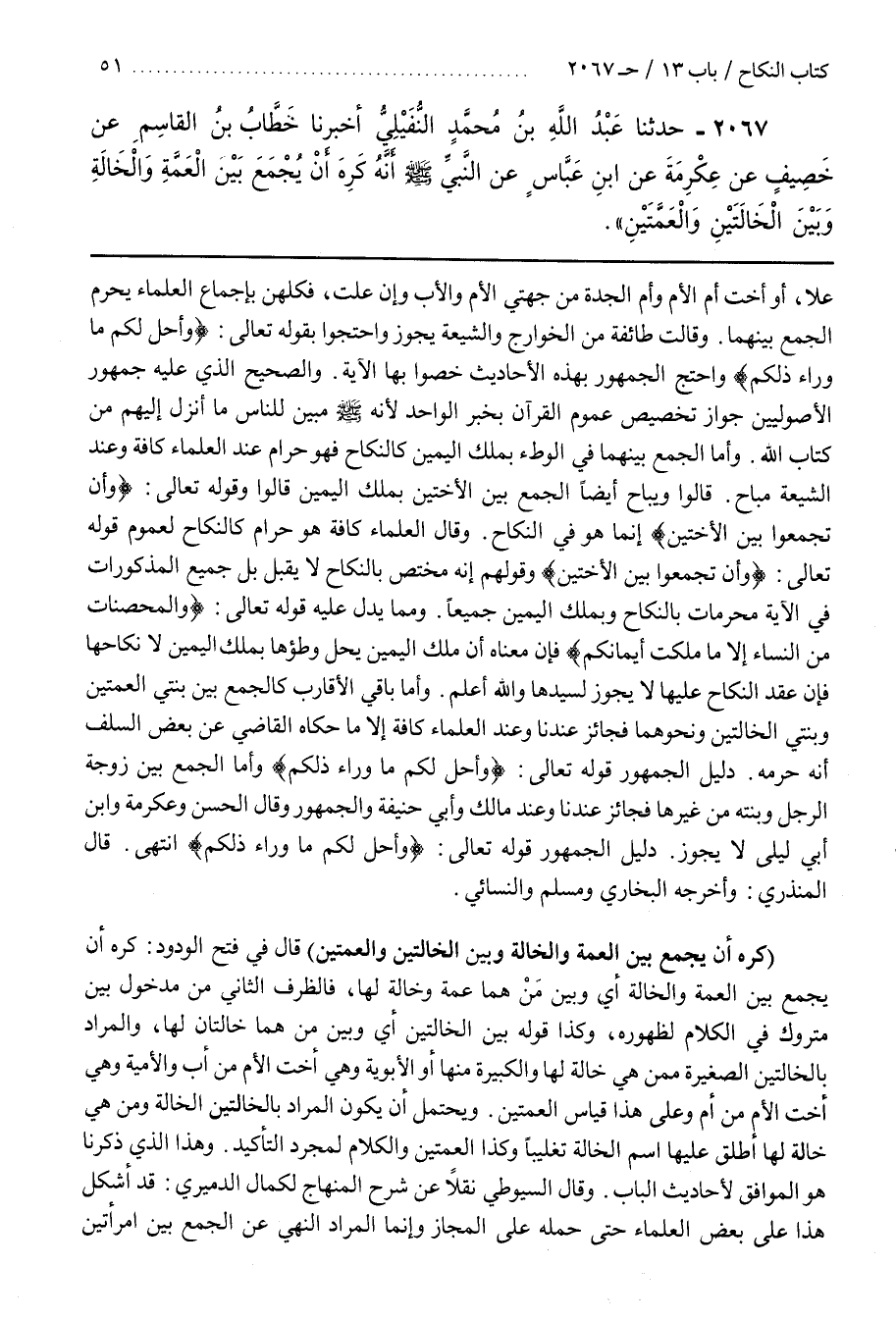 [2067] (كَرِهَ أَنْ يُجْمَعَ بَيْنَ الْعَمَّةِ وَالْخَالَةِ وَبَيْنَ الْخَالَتَيْنِ وَالْعَمَّتَيْنِ) قَالَ فِي فَتْحِ الْوَدُودِ كُرِهَ أَنْ يُجْمَعَ بَيْنَ الْعَمَّةِ وَالْخَالَةِ أَيْ وَبَيْنَ مَنْ هُمَا عَمَّةٌ وَخَالَةٌ لَهَا فَالظَّرْفُ الثَّانِي مِنْ مَدْخُولِ بَيْنَ مَتْرُوكٌ فِي الْكَلَامِ لِظُهُورِهِ وَكَذَا قَوْلُهُ بَيْنَ الْخَالَتَيْنِ أَيْ وَبَيْنَ مَنْ هُمَا خَالَتَانِ لَهَا وَالْمُرَادُ بَالْخَالَتَيْنِ الصَّغِيرَةُ مِمَّنْ هِيَ خَالَةٌ لَهَا وَالْكَبِيرَةُ مِنْهَا أَوِ الْأَبَوِيَّةُ وَهِيَ أُخْتُ الْأُمِّ مِنْ أَبٍ وَالْأُمِّيَّةُ وَهِيَ أُخْتُ الْأُمِّ مِنْ أُمٍّ وَعَلَى هَذَا قِيَاسُ الْعَمَّتَيْنِ