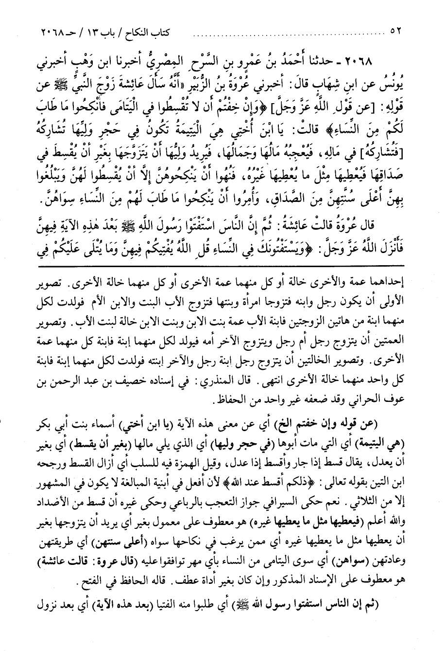 [2068] (عَنْ قَوْلِهِ وَإِنْ خِفْتُمْ الخ) أي عن معنى هذه الآية (ياابن أُخْتِي) أَسْمَاءُ بِنْتُ أَبِي بَكْرٍ (هِيَ الْيَتِيمَةُ) أَيِ الَّتِي مَاتَ أَبُوهَا (فِي حِجْرِ وَلِيِّهَا) أَيِ الَّذِي يَلِي مَالَهَا (بِغَيْرِ أَنْ يُقْسِطَ) أَيْ بِغَيْرِ أَنْ يَعْدِلَ يُقَالُ قَسَطَ إِذَا جَارَ وَأَقْسَطَ إِذَا عَدَلَ وَقِيلَ الْهَمْزَةُ فِيهِ للسلب أي أزال القسط ورجحه بن التِّينِ بِقَوْلِهِ تَعَالَى ذَلِكُمْ أَقْسَطُ عِنْدَ اللَّهِ لِأَنَّ أَفْعَلَ فِي أَبْنِيَةِ الْمُبَالَغَةِ لَا يَكُونُ فِي الْمَشْهُورِ إِلَّا مِنَ الثُّلَاثِيِّ