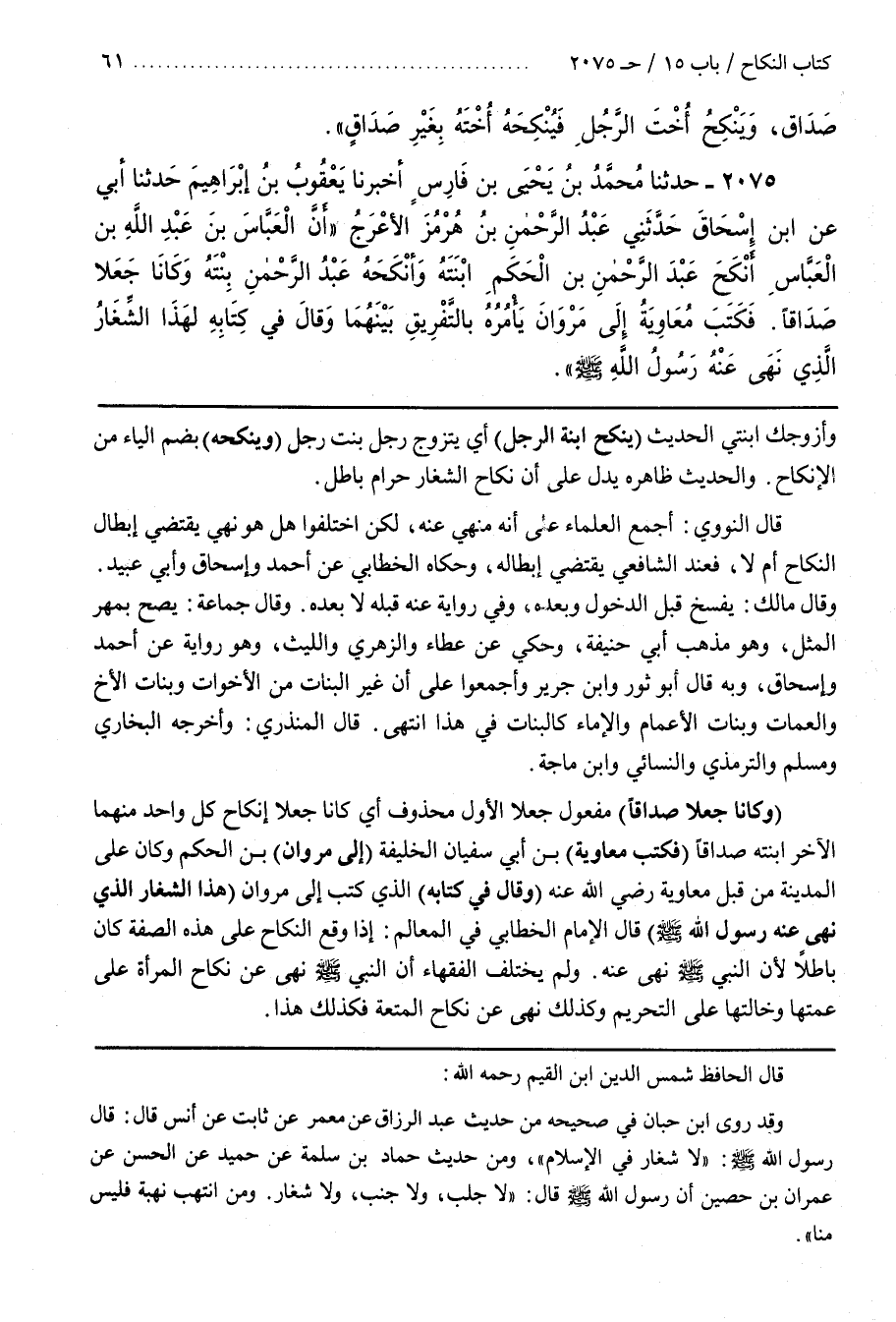 [2075] (وَكَانَا جَعَلَا صَدَاقًا) مَفْعُولُ جَعَلَا الْأَوَّلُ مَحْذُوفٌ أَيْ كَانَا جَعَلَا إِنْكَاحَ كُلِّ وَاحِدٍ مِنْهُمَا الْآخَرَ ابْنَتَهُ صَدَاقًا (فَكَتَبَ مُعَاوِيَةُ) بْنُ أَبِي سُفْيَانَ الْخَلِيفَةُ (إِلَى مَرْوَانَ) بْنِ الْحَكَمِ وَكَانَ عَلَى الْمَدِينَةِ مِنْ قِبَلِ مُعَاوِيَةَ رَضِيَ اللَّهُ عَنْهُ (وَقَالَ فِي كِتَابِهِ) الَّذِي كَتَبَ إِلَى مَرْوَانَ (هَذَا الشِّغَارُ الَّذِي نَهَى عَنْهُ رَسُولُ اللَّهِ صَلَّى اللَّهُ عَلَيْهِ وَسَلَّمَ) قال الْإِمَامُ الْخَطَّابِيُّ فِي الْمَعَالِمِ إِذَا وَقَعَ النِّكَاحُ عَلَى هَذِهِ الصِّفَةِ كَانَ بَاطِلًا لِأَنَّ النَّبِيَّ صَلَّى اللَّهُ عَلَيْهِ وَسَلَّمَ نَهَى عَنْهُ