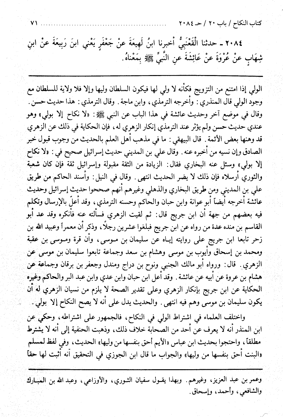 وَقَالَ فِي مَوْضِعٍ آخَرَ وَحَدِيثُ عَائِشَةَ فِي هَذَا الْبَابِ عَنِ النَّبِيِّ صَلَّى اللَّهُ عَلَيْهِ وَسَلَّمَ لَا نِكَاحَ إِلَّا بِوَلِيٍّ وَهُوَ عِنْدِي حَدِيثٌ حَسَنٌ وَلَمْ يُؤَثِّرْ عِنْدَ التِّرْمِذِيِّ إِنْكَارُ الزُّهْرِيِّ لَهُ فَإِنَّ الْحِكَايَةَ فِي ذَلِكَ عَنِ الزُّهْرِيِّ قَدْ وَهَّنَهَا بَعْضُ الْأَئِمَّةِ