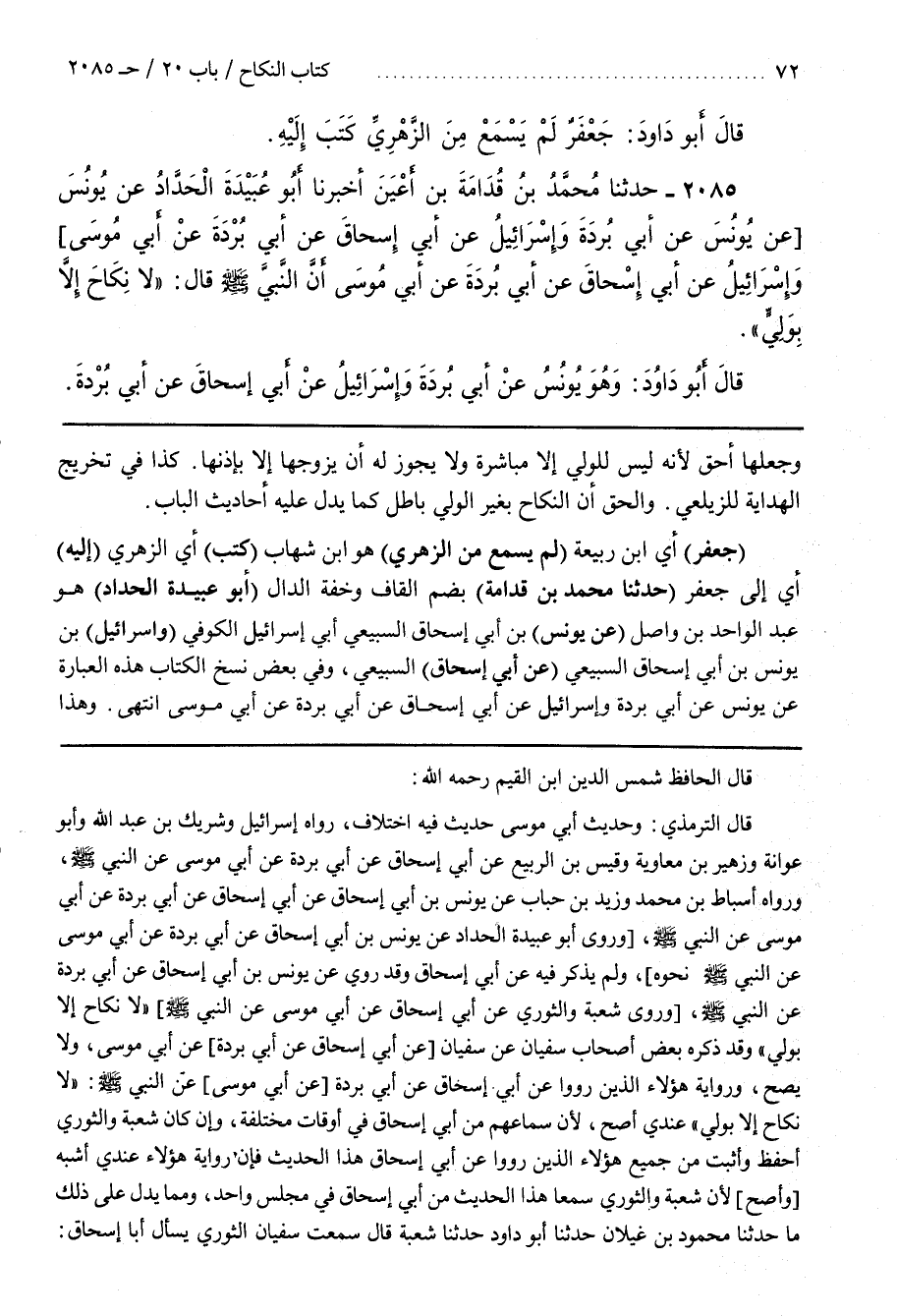 ــــــــــــQقال الحافظ شمس الدين بن القيم رحمه اللَّه قَالَ التِّرْمِذِيّ وَحَدِيث أَبِي مُوسَى حَدِيث فِيهِ اِخْتِلَاف رَوَاهُ إِسْرَائِيل وَشَرِيك بْن عَبْد اللَّه وَأَبُو عَوَانَة وَزُهَيْر بْن مُعَاوِيَة وَقَيْس بْن الرَّبِيع عَنْ أَبِي إِسْحَاق عَنْ أَبِي بُرْدَة عَنْ أَبِي مُوسَى عَنْ النَّبِيّ صَلَّى اللَّه عَلَيْهِ وَسَلَّمَ وَرَوَاهُ أَسْبَاط بْن مُحَمَّد وَزَيْد بْن حُبَاب عَنْ يُونُس بْن أَبِي إِسْحَاق عَنْ أَبِي إِسْحَاق عَنْ أَبِي بُرْدَة عَنْ أَبِي مُوسَى عَنْ النَّبِيّ صَلَّى اللَّه عَلَيْهِ وَسَلَّمَ (وَرَوَى أَبُو عُبَيْدَة الْحَدَّاد عَنْ يُونُس بْن أَبِي إِسْحَاق عَنْ أَبِي بُرْدَة عَنْ أَبِي مُوسَى عَنْ النَّبِيّ صَلَّى اللَّه عَلَيْهِ وَسَلَّمَ وَنَحْوه) وَلَمْ يَذْكُر فِيهِ عَنْ أَبِي إِسْحَاق وَقَدْ رُوِيَ عَنْ يُونُس بْن أَبِي إِسْحَاق عَنْ أَبِي بُرْدَة عَنْ النَّبِيّ صَلَّى اللَّه عَلَيْهِ وَسَلَّمَ (وَرَوَى شُعْبَة وَالثَّوْرِيُّ عَنْ أَبِي إِسْحَاق عَنْ أَبِي مُوسَى عَنْ النَّبِيّ صَلَّى اللَّه عَلَيْهِ وَسَلَّمَ) لَا نِكَاح إِلَّا بِوَلِيٍّ وَقَدْ ذَكَرَ بَعْض أَصْحَاب سُفْيَان عَنْ سُفْيَان (عَنْ أَبِي إِسْحَاق عَنْ أَبِي بُرْدَة) عَنْ أَبِي مُوسَى وَلَا يَصِحّ وَرِوَايَة هَؤُلَاءِ الَّذِينَ رَوَوْا عَنْ أَبِي إِسْحَاق عَنْ أَبِي بُرْدَة (عَنْ أَبِي مُوسَى) عَنْ النَّبِيّ صَلَّى اللَّه عَلَيْهِ وَسَلَّمَ لَا نِكَاح إِلَّا بِوَلِيٍّ عِنْدِي أَصَحّ لِأَنَّ سَمَاعهمْ مِنْ أَبِي إِسْحَاق فِي أَوْقَات مُخْتَلِفَة وَإِنْ كَانَ شُعْبَة وَالثَّوْرِيُّ أَحْفَظ وَأَثْبَت مِنْ جَمِيع هَؤُلَاءِ الَّذِينَ رَوَوْا عَنْ أَبِي إِسْحَاق هَذَا الْحَدِيث فَإِنَّ رِوَايَة هَؤُلَاءِ عِنْدِي أَشْبَه (وَأَصَحّ) لِأَنَّ شُعْبَة وَالثَّوْرِيَّ سَمِعَا هَذَا الْحَدِيث مِنْ أَبِي إِسْحَاق فِي مَجْلِس وَاحِد وَمِمَّا يَدُلّ عَلَى ذَلِكَ مَا حَدَّثَنَا مَحْمُود بْن غَيْلَان حَدَّثَنَا أَبُو دَاوُدَ حَدَّثَنَا شُعْبَة قَالَ سَمِعْت سُفْيَان الثَّوْرِيُّ يَسْأَل أَبَا إِسْحَاق
