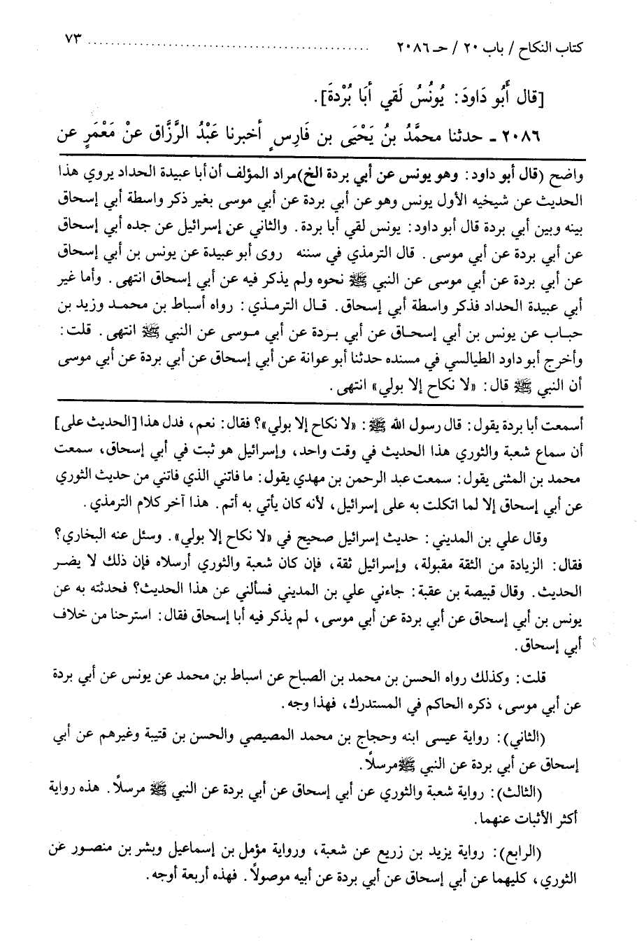 ــــــــــــQأَسَمِعْت أَبَا بُرْدَة يَقُول قَالَ رَسُول اللَّه صَلَّى اللَّه عَلَيْهِ وَسَلَّمَ لَا نِكَاح إِلَّا بِوَلِيٍّ فَقَالَ نَعَمْ فَدَلَّ هَذَا (الْحَدِيث عَلَى) أَنَّ سَمَاع شُعْبَة وَالثَّوْرِيِّ هَذَا الْحَدِيث فِي وَقْت وَاحِد وَإِسْرَائِيل هُوَ ثَبَت فِي أَبِي إِسْحَاق سَمِعْت مُحَمَّد بْن الْمُثَنَّى يَقُول سَمِعْت عَبْد الرَّحْمَن بْن مَهْدِيّ يَقُول مَا فَاتَنِي الَّذِي فَاتَنِي مِنْ حَدِيث الثَّوْرِيِّ عَنْ أَبِي إِسْحَاق إِلَّا لِمَا اِتَّكَلْت بِهِ عَلَى إِسْرَائِيل لِأَنَّهُ كَانَ يَأْتِي بِهِ أَتَمَّ