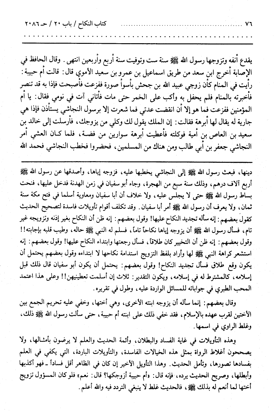 ــــــــــــQدِينهَا فَبَعَثَ رَسُول اللَّه صَلَّى اللَّه عَلَيْهِ وَسَلَّمَ إِلَى النَّجَاشِيّ يَخْطُبهَا عَلَيْهِ فَزَوَّجَهُ إِيَّاهَا وَأَصْدَقَهَا عَنْ رَسُول اللَّه صَلَّى اللَّه عَلَيْهِ وَسَلَّمَ أَرْبَعَة آلَاف دِرْهَم وَذَلِكَ سَنَة سَبْع مِنْ الْهِجْرَة وَجَاءَ أَبُو سُفْيَان فِي زَمَن الْهُدْنَة فَدَخَلَ عَلَيْهَا فَنَحَّتْ بِسَاط رَسُول اللَّه صَلَّى اللَّه عَلَيْهِ وَسَلَّمَ حَتَّى لَا يَجْلِس عَلَيْهِ وَلَا خِلَاف أَنَّ أَبَا سُفْيَان وَمُعَاوِيَة أَسْلَمَا فِي فَتْح مَكَّة سَنَة ثَمَان وَلَا يُعْرَف أَنَّ رَسُول اللَّه صَلَّى اللَّه عَلَيْهِ وَسَلَّمَ أَمَرَ أَبَا سُفْيَان