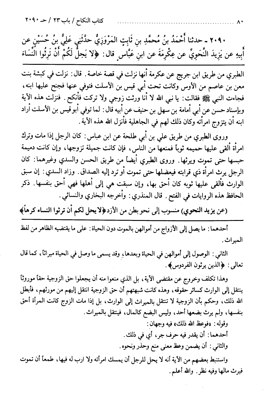 [2090] (عَنْ يَزِيدَ النَّحْوِيِّ) مَنْسُوبٌ إِلَى نَحْوٍ بَطْنٌ مِنَ الْأَزْدِ (لَا يَحِلُّ لَكُمْ أَنْ تَرِثُوا النِّسَاءَ كرها