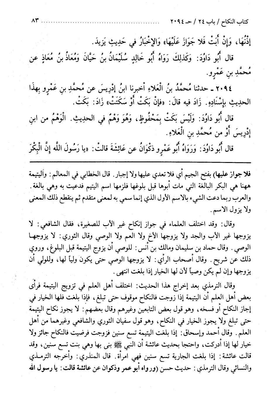 وَقَالَ التِّرْمِذِيُّ بَعْدَ إِخْرَاجِ هَذَا الْحَدِيثِ اخْتَلَفَ أَهْلُ الْعِلْمِ فِي تَزْوِيجِ الْيَتِيمَةِ فَرَأَى بَعْضُ أَهْلِ الْعِلْمِ أَنَّ الْيَتِيمَةَ إِذَا زُوِّجَتْ فَالنِّكَاحُ مَوْقُوفٌ حَتَّى تبلغ فإذا بلغت فلها الخيار في إجاز النِّكَاحِ أَوْ فَسْخِهِ وَهُوَ قَوْلُ بَعْضِ التَّابِعِينَ وَغَيْرِهِمْ وَقَالَ بَعْضُهُمْ لَا يَجُوزُ نِكَاحُ الْيَتِيمَةِ حَتَّى تَبْلُغَ وَلَا يَجُوزُ الْخِيَارُ فِي النِّكَاحِ وَهُوَ قَوْلُ سُفْيَانَ الثَّوْرِيِّ وَالشَّافِعِيِّ وَغَيْرِهِمَا مِنْ أَهْلِ الْعِلْمِ