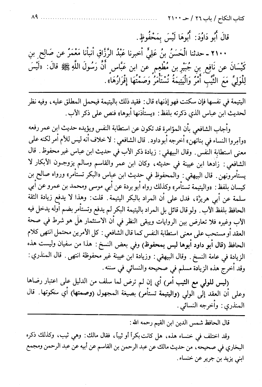 وَلَوْ قَالَ قَائِلٌ بَلِ الْمُرَادُ بَالْيَتِيمَةِ الْبِكْرُ لَمْ يَدْفَعْ وَتُسْتَأْمَرُ بِضَمِّ أَوَّلِهِ يَدْخُلُ فِيهِ الْأَبُ وَغَيْرُهُ فَلَا تَعَارُضَ بَيْنَ الرِّوَايَاتِ وَيَبْقَى النَّظَرُ فِي أَنَّ الِاسْتِئْمَارَ هَلْ هُوَ شَرْطٌ فِي صِحَّةِ الْعَقْدِ أَوْ مُسْتَحَبٌّ عَلَى مَعْنَى اسْتِطَابَةِ النفس كما قال الشافعي كل الْأَمْرَيْنِ مُحْتَمَلٌ انْتَهَى كَلَامُ الْحَافِظِ (قَالَ أَبُو دَاوُدَ أَبُوهَا لَيْسَ بِمَحْفُوظٍ) وَفِي بَعْضِ النُّسَخِ هَذَا مِنْ سُفْيَانَ وَلَيْسَتْ هَذِهِ الزِّيَادَةُ فِي عامة النسخ