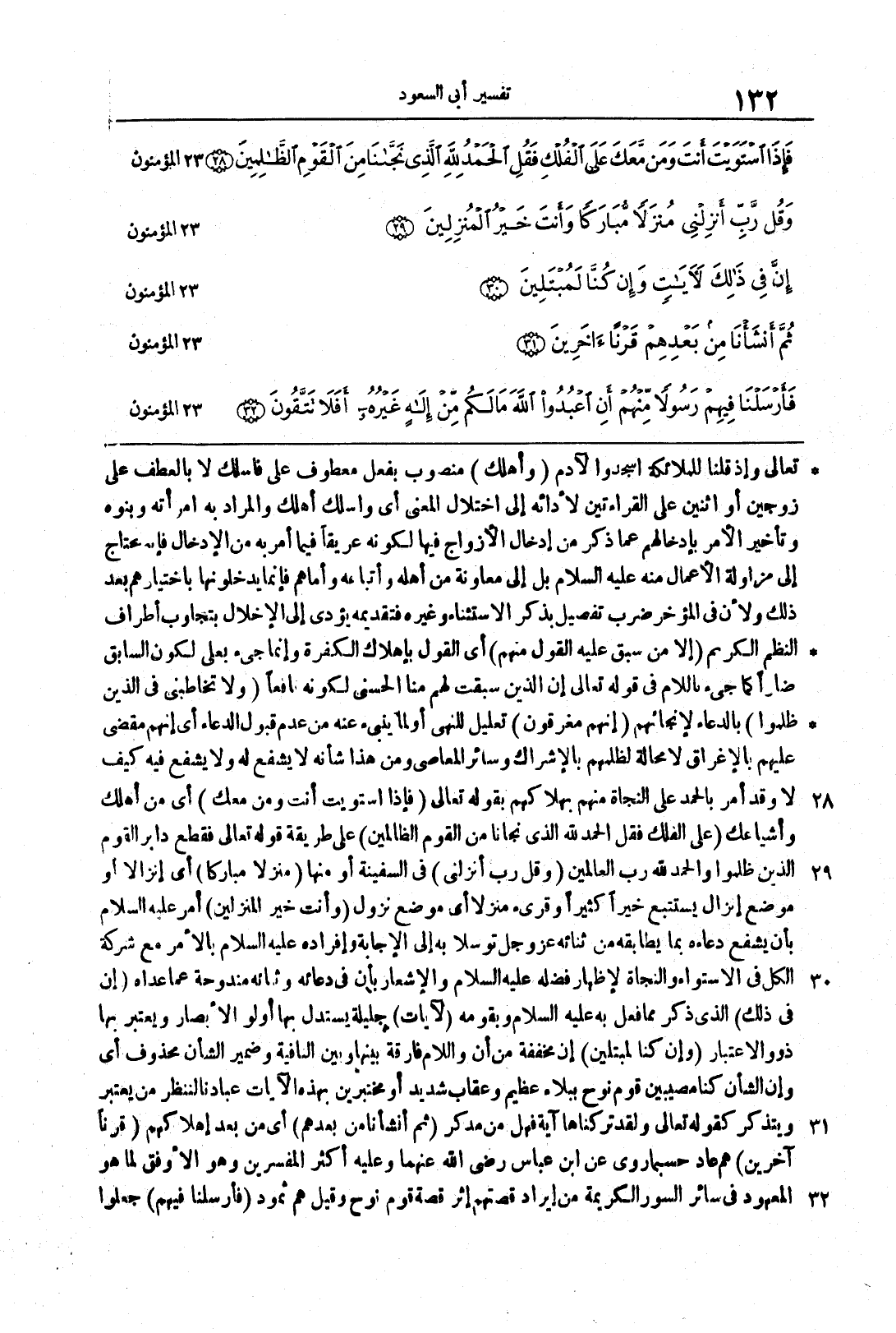 سورة المؤمنون (28 32) تعالى وَإِذْ قُلْنَا للملائكة اسجدوا لاِدَمَ {وَأَهْلَكَ} منصوبٌ بفعل معطوف على فاسلُك لا بالعطف على زوجينِ أو اثنين على القراءتينِ لأدائه إلى اختلالِ المعنى أي واسلُك أهلَك والمرادُ به امرأتُه وبنُوه وتأخيرُ الأمر بإدخالهم عمَّا ذُكر من إدخال الأزواجِ فيها لكونِه عريقاً فيما أُمر به من الإدخال فإن نحتاج إلى مزاولة الأعمالِ منه عليه السَّلامُ بل إلى معاونةٍ من أهلِه وأتباعِه وأماهم فإنَّما يدخلونَها باختيارِهم بعد ذلك ولأنَّ في المؤخَّر ضربَ تفصيلٍ بذكر الاستثناء وغيرِه فتقديمُه يؤدِّي إلى الإخلالِ بتجاوبِ أطرافِ النظمِ الكريم ي {إِلاَّ مَن سَبَقَ عَلَيْهِ القول مِنْهُمْ} أي القولُ بإهلاكِ الكَفَرةِ وإنَّما جيء بعلى لكون السابقِ ضارًّا كما جيء باللامِ في قوله تعالى إن الذين سَبَقَتْ لَهُمْ مّنَّا الحسنى لكونِه نافعاً {وَلاَ تخاطبنى فِى الذين ظَلَمُواْ} بالدُّعاءِ لإنجائهم {إِنَّهُمْ مُّغْرَقُونَ} تعليلٌ للنهي أو لما ينبئ عنه من عدم قبول الدُّعاءِ أي إنَّهم مقضيٌّ عليهم بالإغراقِ لا محالةَ لظُلمهم بالإشراك وسائر المَعَاصي ومَن هذا شأنُه لا يُشفعُ له ولا يُشفَّعُ فيه كيف لا وقد أُمر بالحمدِ على النَّجاةِ منهم بهلاكِهم بقوله تعالى