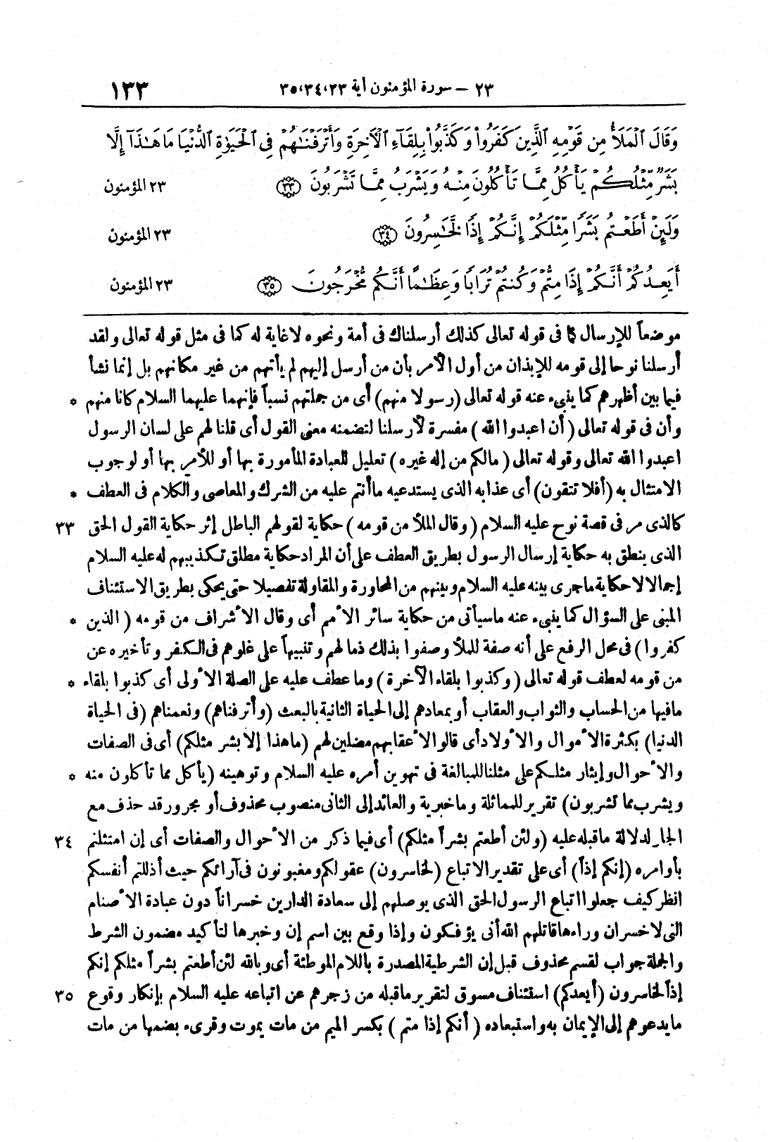 سورة المؤمنون (33 35) موضعاً للإرسالِ كَما في قولِه تعالى كَذَلِكَ أَرْسَلْنَاكَ فِى أُمَّةٍ ونحوه لا غايةً له كما في مثلِ قولِه تعالى وَلَقَدْ أَرْسَلْنَا نُوحًا إلى قَوْمِهِ للإيذانِ من أولِ الأمرِ بأنَّ مَن أُرسل إليهم لم يأتِهم من غير مكانِهم بل إنَّما نشأَ فيما بين أظهرِهم كما ينبئ عنه قولُه تعالى {رَسُولاً مّنْهُمْ} أي من جُملتهم نسباً فإنَّهما عليهما السَّلامُ كانا منهم وأنْ في قولِه تعالَى {أن اعبدوا الله} مفسِّرةٌ لأرسلنا لتضمُّنِه معنى القولِ أي قُلنا لهم على لسانِ الرَّسولِ اعبدُوا الله تعالى وقولُه تعالى {مَّا لَكُمْ مّنْ إله غَيْرُهُ} تعليلٌ للعبادة المأمورة بها أو للأمرِ بها أو لوجوبِ الامتثالِ بهِ {أَفَلاَ تَتَّقُونَ} أي عذابَه الذي يستدعيه ما أنتُم عليه من الشِّركِ والمعاصي والكلامُ في العطفِ كالذي مرَّ في قصَّةِ نوحٍ عيه السَّلامُ