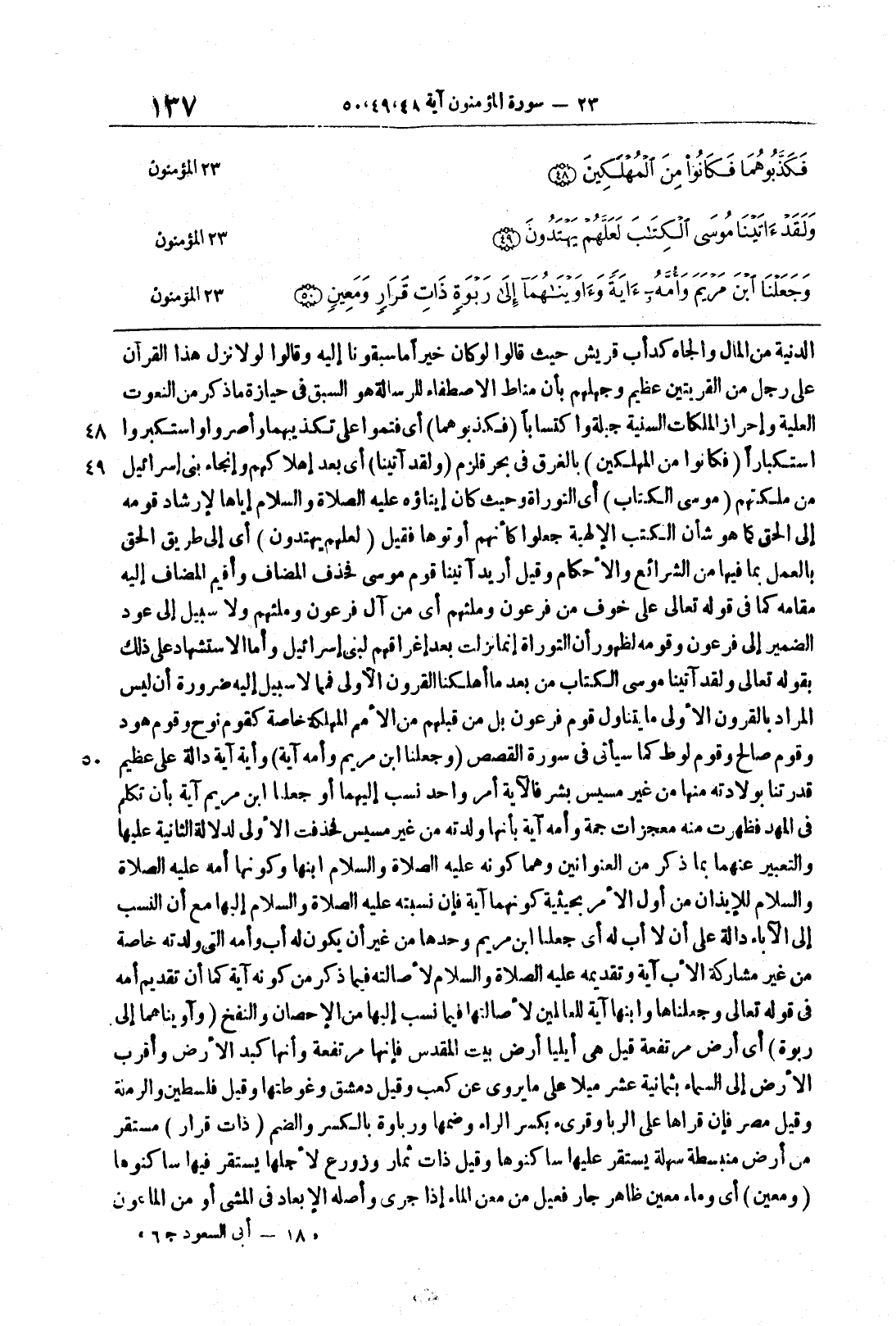 سورة المؤمنين (48 50) الدَّنيةِ من المالِ والجاهِ كدأبِ قُريشٍ حيثُ قالُوا لَوْ كَانَ خَيْراً مَّا سَبَقُونَا إِلَيْهِ وقالُوا لَوْلاَ نُزِّل هذا القرآنُ على رَجُلٍ مّنَ القريتينِ عظيم وجهلِهم بأنَّ مناطَ الاصطفاءِ للرِّسالةِ هو السَّبقُ في حيازةِ ما ذُكر من النُّعوت العليةِ وإحرازِ الملَكات السَّنية جِبِلّةً واكتساباً