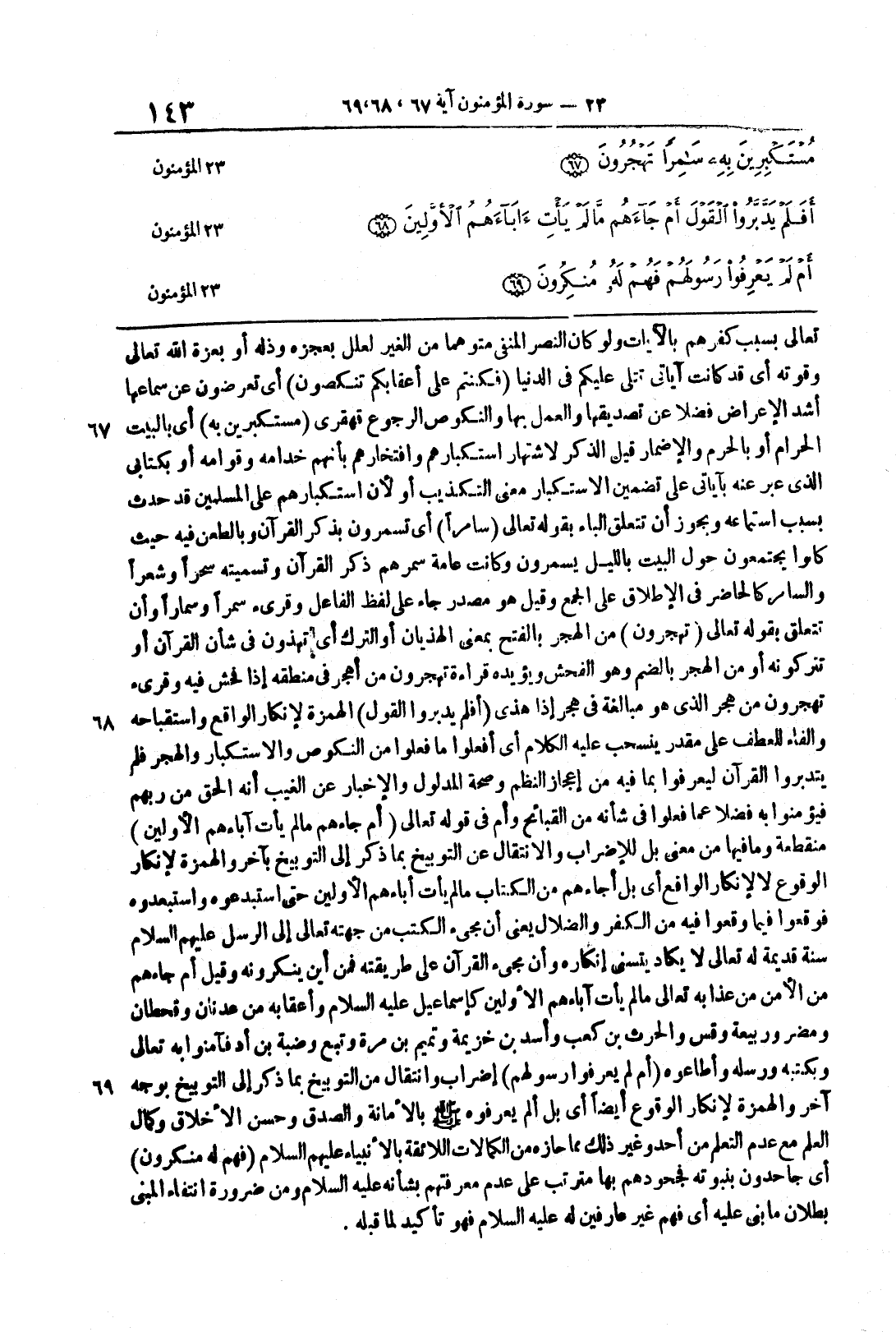 سورة المؤمنون (67 69) تعالى بسببِ كُفرِهم بالآياتِ ولو كانَ النَّصرُ المنفيُّ مُتوهَّماً من الغيرِ لعُلِّل بعجزه وذُلِّه أو بعزَّةِ الله تعالى وقوَّتهِ أي قد كانتْ آياتي تُتلى عليكم في الدنيا {فكنتم على أعقابكم تَنكِصُونَ} أي تُعرضون عن سماعها أشدَّ الإعراضِ فضلاً عن تصديقها والعملِ بها والنُّكوصُ الرُّجوعُ قهقرى