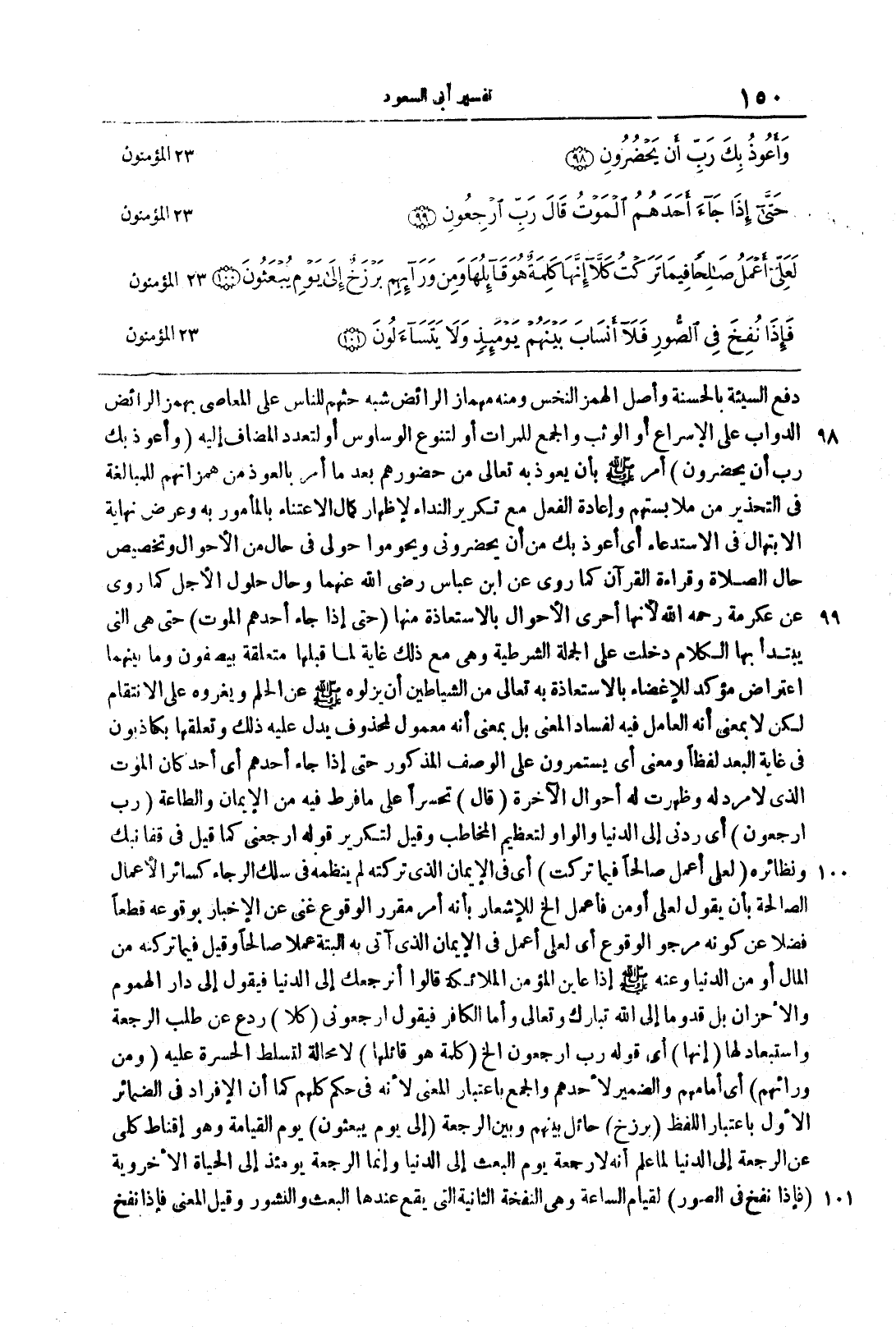 {وَأَعُوذُ بِكَ رَبّ أَن يحضرون} أمر صلى الله عليه وسلم بأنْ يعوذَ به تعالى من حضورِهم بعد ما أمر بالعوذ من همزاتِهم للمبالغة في التَّحذيرِ مِن مُلابستهم وإعادةُ الفعلِ مع تكريرِ النِّداءِ لإظهارِ كمالِ الاعتناءِ بالمأمورِ به وعرضِ نهايةِ الابتهالِ في الاستدعاءِ أي أعوذُ بك مِن أنْ يحضرونِي ويحومُوا حولي في حالٍ من الأحوالِ وتخصيصُ حالِ الصَّلاةِ وقراءةِ القُرآنِ كما رُويَ عن ابنِ عباس رضي الله عنهما وحالِ حلولِ الأجلِ كما روى عن عكرمة رحمه الله لأنَّها أحرى الأحوالِ بالاستعاذةِ منها