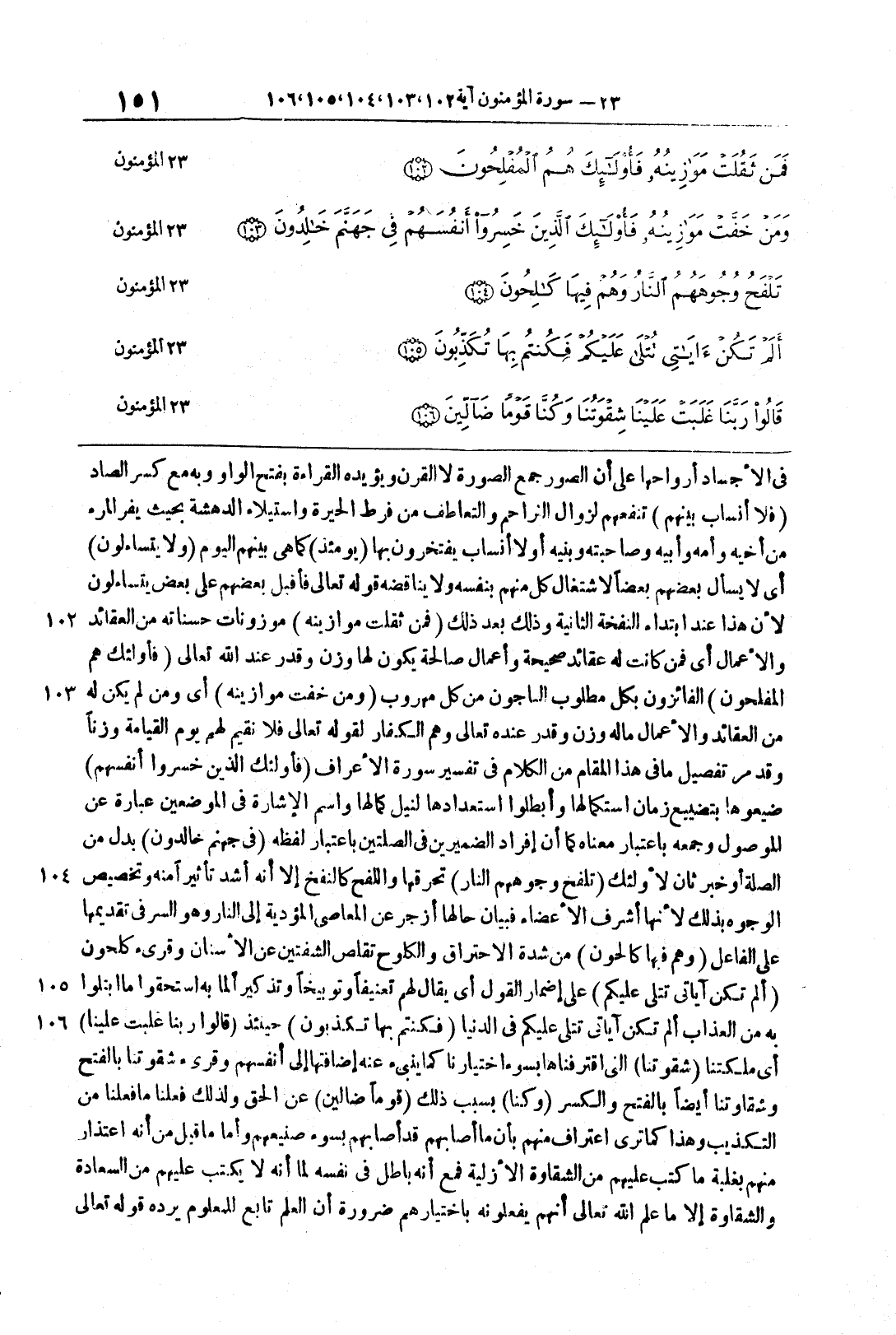 سورة المؤمنون (102 106) في الأجساد أرواحُها على أنَّ الصُّورَ جمع الصُّورةِ لا القَرنِ ويؤيِّده القراءةُ بفتح الواو به مع كسرِ الصَّادِ {فَلاَ أنساب بَيْنَهُمْ} تنفعُهم لزوال الزاحم والتَّعاطُفِ من فرط الحيرة واستيلاءِ الدَّهشةِ بحيث يفرُّ المرءُ مِنْ أَخِيهِ وأمِّه وَأَبِيهِ وصاحبتِه وبنيهِ أو لا أنسابَ يفتخرون بها {يَوْمَئِذٍ} كما هي بينُهم اليَّومَ {وَلاَ يَتَسَاءلُونَ} أي لا يسألُ بعضُهم بعضاً لاشتغالِ كلَ منهُم بنفسِه ولا يناقضُه قولُه تعالى فَأَقْبَلَ بَعْضُهُمْ على بَعْضٍ يَتَسَاءلُونَ لأنَّ هذا عند ابتداءِ النَّفخةِ الثَّانيةِ وذلك بعد ذلك