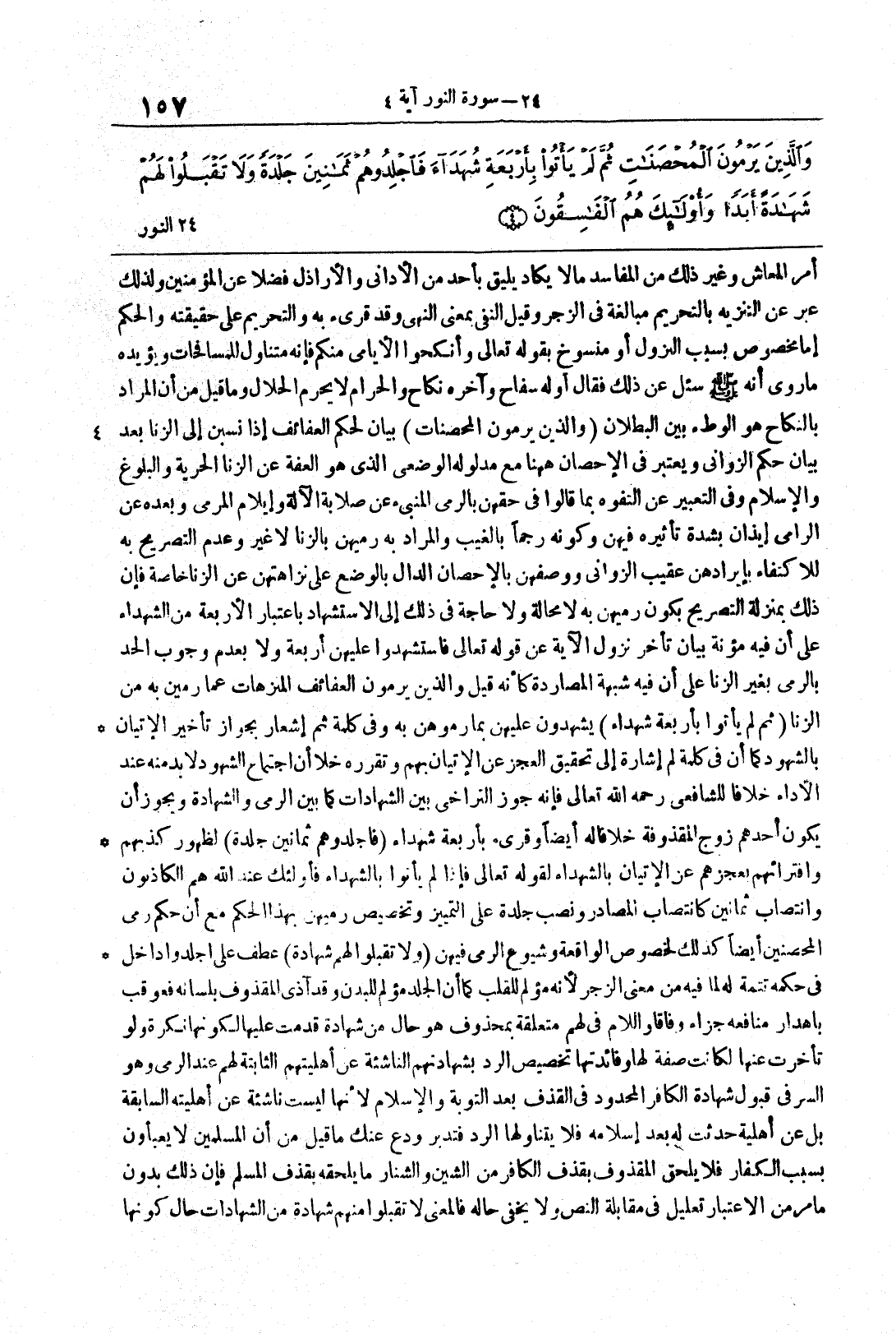 {والذين يَرْمُونَ المحصنات} بيانٌ لحكمِ العَفَائفِ إذا نُسبن إلى الزِّنا بعد بيانِ حُكمِ الزَّوانِي ويُعتبر في الإحصان ههنا مع مدلولهِ الوضعيِّ الذي هو العِفَّةُ عن الزِّنا الحريَّةُ والبُلوغُ والإسلامُ وفي التَّعبيرِ عن التَّفوهِ بما قالُوا في حقهنَّ بالرَّمي المنبئ عن صلابةِ الآلةِ وإيلامِ المَرميِّ وبعدِه عن الرَّامِي إيذانٌ بشدَّةِ تأثيره فيهنَّ وكونهِ رجماً بالغيبِ والمرادُ به رميهنَّ بالزِّنا لا غير وعدمُ التَّصريحِ به للاكتفاءِ بإيرادهنَّ عقيبَ الزَّواني ووصفِهنَّ بالإحصانِ الدَّالِّ بالوضعِ على نزاهتهن عن الزنا خاصَّة فإنَّ ذلكَ بمنزلةِ التَّصريحِ بكونِ رميهنَّ به لا محالة ولا حاجة في ذلكَ إلى الاستشهادِ باعتبارِ الأربعةِ من الشُّهداءِ على أنَّ فيه مؤنة بيانِ تأخُّرِ نزولِ الآيةِ عن قوله تعالى فاستشهدوا عَلَيْهِنَّ أَرْبَعةً ولا بعدمِ وجوبِ الحدِّ بالرَّميِ بغيرِ الزنا على أنَّ فيه شبهة المصاردة كأنَّه قيلَ والذينَ يرمُون العفائفَ المنزَّهاتِ عمَّا رُمين به من الزنا {ثُمَّ لَمْ يَأْتُواْ بِأَرْبَعَةِ شُهَدَاء} يشهدونَ عليهنَّ بما رموهنَّ به وفي كلمةِ ثمَّ إشعارٌ بجوازِ تأخيرِ الإتيانِ بالشُّهودِ كما أنَّ في كلمةِ لم إشارةً إلى تحقيق العجزِ عن الإتيانِ بهم وتقرره خلا أنَّ اجتماعَ الشُّهودِ لا بُدَّ منه عندَ الأداءِ خلافاً للشَّافعيِّ رحمه الله تعالى فإنَّه جَوَّزَ التَّراخي بينَ الشَّهاداتِ كما بينَ الرَّميِ والشَّهادةِ ويجوزُ أنْ يكونَ أحدُهم زوجَ المقذوفةِ خلافا له أيضا وقرئ بأربعة شهداء {فاجلدوهم ثَمَانِينَ جَلْدَةً} لظهورِ كذبهِم وافترائِهم بعجزِهم عن الإتيانِ بالشُّهداءِ لقوله تعالى فإذا لَمْ يَأْتُواْ بِالشُّهَدَاء فَأُوْلَئِكَ عِندَ الله هُمُ الكاذبون وانتصابُ ثمانينَ كانتصابِ المصادرِ ونصبُ جلدةً على التَّمييزِ وتخصيصُ رميهنَّ بهذا الحكم مع أنَّ حكم رَميِ المُحصنين أيضاً كذلك لخصوصِ الواقعةِ وشيوعِ الرَّمي فيهنَّ {وَلاَ تَقْبَلُواْ لَهُمْ شَهَادَةً} عطفٌ على اجلدُوا داخلٌ في حكمهِ تتمةٌ له لما فيه من معنى الزَّجرِ لأنَّه مؤلمٌ للقلبِ كما أنَّ الجلدَ مؤلمٌ للبدنِ وقد آذى المقذوفَ بلسانه فعُوقبَ بإهدار منافعهِ جزاءً وِفاقاً واللاَّمُ في لهُم متعلقةٌ بمحذوفٍ هو حالٌ من شهادةً قدمتْ عليها لكونها نكرةً ولو تأخرتْ عنها لكانتْ صفةً لها وفائدتُها تخصيصُ الردِّ بشهادتهم النَّاشئةِ عن أهليَّتهم الثَّابتةِ لهم عندَ الرَّميِ وهُو السِّرُّ في قبولِ شهادةِ الكافرِ المحدودِ في القذفِ بعد التَّوبةِ والإسلامِ لأنَّها ليستْ ناشئةً عن أهليَّتهِ السَّابقةِ بل عن أهلية حَدَثتْ له بعد إسلامهِ فلا يتناولُها الردُّ فتدبَّرْ ودعْ عنك ما قيل من أنَّ المسلمينَ لا يعبأون بسبب الكفَّارِ فلا يلحقُ المقذوفَ بقذفِ الكافرِ من الشَّينِ والشَّنارِ ما يلحقهُ بقذفِ المسلمِ فإنَّ ذلكَ بدونِ مامر من الاعتبارِ تعليلٌ في مُقابلةِ النصِّ ولا يخفى حالُه فالمعنى لا تقبلُوا منهم شهادةً من الشَّهاداتِ حال كونها