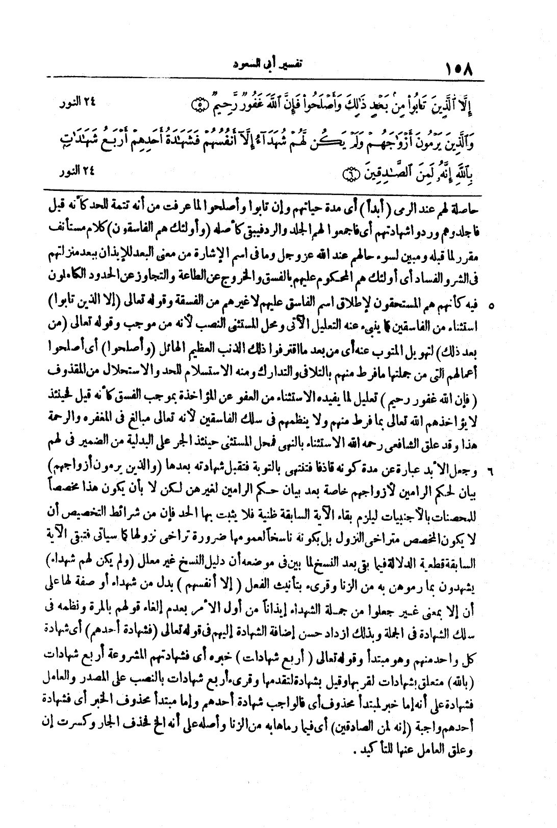 سورة النور (5 6) حاصلةً لهم عندَ الرَّميِ {أَبَدًا} أي مُدَّة حياتهم وإنْ تابُوا وأصلحُوا لما عرفتَ من أنَّه تتمةٌ للحدِّ كأنَّه قيلَ فاجلدُوهم وردُّوا شهادتهم أي فاجمعُوا لهم الجلدَ والردَّ فيبقى كأصله {وَأُوْلَئِكَ هُمُ الفاسقون} كلامٌ مستأنفٌ مقررٌ لما قبلَه ومبينٌ لسُّوءِ حالهم عند الله عز وجل وما في إسمِ الإشارةِ من معنى البعد للإيذان ببعد منزلتهم في الشر والفسادِ أيْ أُولئك هم المحكومُ عليهم بالفسقِ والخروجِ عن الطَّاعةِ والتَّجاوزِ عن الحدودِ الكاملون فيه كأنَّهم هم المستحقُّون لإطلاقِ اسمِ الفاسقِ عليهم لا غيرُهم منَ الفَسَقةِ وقولُه تعالَى