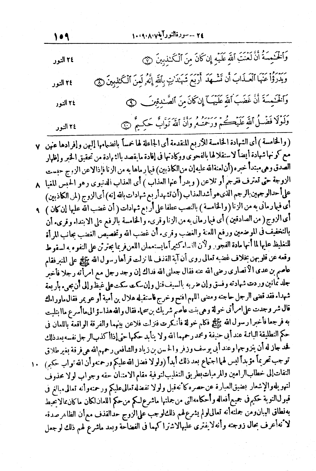 {والخامسة} بالنصب على أربع شهادات {أَنَّ غَضَبَ الله عَلَيْهَا إِن كَانَ} أي الزوج {مِنَ الصادقين} أي فيما رَمَاني به في الزنا وقرئ والخامسةُ بالرَّفعِ على الابتداءِ وقرئ أنْ بالتَّخفيفِ في الموضعينِ ورفع اللعنة والغضب وقرئ أنْ غضِبَ اللَّهُ وتخصيصُ الغضبِ بجانبِ المرأةِ للتغليظِ عليها لما أنَّها مادةُ الفجورِ ولأنَّ النِّساءَ كثيراً ما يستعملنَ اللَّعن فربما يجترئن على التفوُّهِ به لسقوطِ وقعهِ عن قلوبهنَّ بخلافِ غضبهِ تعالى رُوي أنَّ آيةَ القذفِ لمَّا نزلتْ قرأها رسولُ اللَّهِ صلى الله عليه وسلم على المنبرِ فقامَ عاصمُ بن عدي الأنصاري رضيَ الله عنه فقالَ جعلني اللَّهُ فداكَ إنْ وجدَ رجلٌ مع امرأته رجُلاً فأخبرَ جُلد ثمانينَ ورُدَّتْ شهادتُه وفُسِّقَ وإنْ ضربه بالسَّيفِ قُتل وإن سكت سكت عل غيظٍ وإلى أنْ يجيءَ بأربعةِ شهداءَ فقد قضى الرَّجلُ حاجته ومضى اللهمَّ افتحْ وخرجَ فاستقبله هلالُ بن أُميَّة أو عُويمرٌ فقال ما وراءكَ قالَ شَرٌّ وجدتُ على امرأتي خَوْلة وهي بنتُ عاصمٍ شريك بن سحماه فقالَ واللَّهِ هذا سُؤالي ما أسرعَ ما ابتُليتَ به فرجعا فأخبرا رسولَ الله صلى الله عليه وسلم فكلم خولة فأنكرت فنزلت فلاعنَ بينهما والفُرقةُ الواقعةُ باللِّعانِ في حُكم التَّطليقةِ البائنةِ عندَ أبي حنيفةَ ومحمَّدٍ رحمهُما اللَّهُ ولا يتأبَّدُ حكمُها حتَّى إذا أكذبَ الرَّجلُ نفسَه بعدَ ذلكَ فحُدَّ جازَ له أنْ يتزوَّجها وعند أبي يوسف وزُفر والحسنِ بنِ زياد والشَّافعيِّ رحمهم اللَّهُ هي فُرقةٌ بغيرِ طلاقٍ تُوجبُ تَحريماً مؤبَّداً ليس لهما اجتماعٌ بعد ذلكَ أبدا
