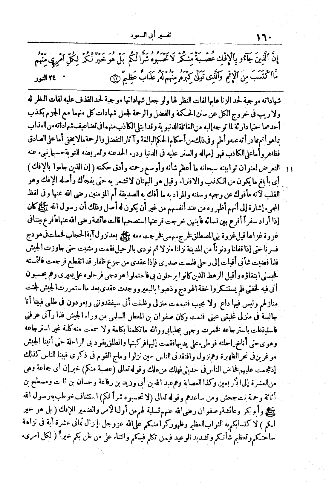 {إن الذين جاؤوا بالإفك} أي بأبلغَ ما يكونُ من الكذبِ والافتراءِ وقيل هو البُهتانُ لا تشعرُ به حتَّى يفجأكَ وأصلُه الإفكُ وهو القلبُ لأنه مأفوكٌ عن وجهه وسننهِ والمرادُ به ما أُفكَ بهِ الصديقة أم المؤمنين رضي الله عنها وفي لفظ المجيءِ إشارةٌ إلى أنَّهم أظهرُوه من عندِ أنفسِهم من غير أن يكون له أصل وذلكَ أنَّ رسولَ اللَّهِ صلى الله علي وسلم كانَ إذا أرادَ سفراً أقرعَ بين نسائهِ فأيتهنَّ خرجتْ قرعتُها استصحبَها قالتْ عائشةَ رضيَ الله عنها فأقرعَ بيننا في غزوةٍ غزاها قيلَ غزوةُ بني المُصطلقِ فخرجَ سهمي فخرجتُ معه صلى الله علي وسلم بعد نزولِ آيةِ الحجابِ فَحُملت في هَوْدجٍ فسرنا حتَّى إذا قفلنا ودنَونا من المدينةِ نزلنا منزلاً ثم نُودي بالرَّحيل فقُمت ومشيتُ حتَّى جاوزتُ الجيشَ فلمَّا قضيتُ شأني أقبلتُ إلى رَحْلي فلمستُ صَدري فإذا عِقدي من جَزَعِ ظَفَارَ قد انقطعَ فرجعتُ فالتمستُه فحبسني ابتغاؤه وأقبلَ الرَّهطُ الذينَ كانُوا يُرحلون بي فاحتملُوا هودجي فرحلوه على بعيري وهم يحسبون أنِّي فيه لخفَّتي فلم يستنكرُوا خفَّة الهودجِ وذهبُوا بالبعير ووجدت عقدي بعد ما استمررت الجيش فجئتُ منازلَهم وليس فيها داعٍ ولا مجيبٌ فتممت منزلي وظننتُ أنِّي سيفقدونني ويعودونَ في طَلَبي فبينا أنا جالسةٌ في منزلي غلبتني عيني فنِمتُ وكانَ صفوانُ بنُ المُعطِّلِ السُّلَميُّ من وراءِ الجيشِ فلمَّا رآنِي عرفنِي فاستيقظتُ باسترجاعهِ فخمرت وجهي بالجلبابي وواللَّهِ ما تكلَّمنا بكلمةٍ ولا سمعتُ منه كلمةً غيرَ استرجاعِه وهَوى حتَّى أناخ راحلته فوطئ على يديها فقمتُ إليها فركبتُها وانطلقَ يقودُ بي الرَّاحلةَ حتى أتينا الجيشَ مُوغرين في نحرِ الظَّهيرةِ وهُم نزولٌ وافتقدنِي النَّاسُ حين نزلُوا وماجَ القومُ في ذكرِي فبينا النَّاسُ كذلكَ إذ هجمتُ عليهم فخاضَ النَّاسُ في حديثي فهلكَ مَن هلكَ وقولُه تعالى {عُصْبَةٌ مّنْكُمْ} خبرُ إنَّ أي جماعةٌ وهي من العشرة إلى الأربعينَ وكذا العِصابةُ وهم عبدُ اللَّهِ بنُ أُبيَ وزيدُ بنُ رفاعة وحسَّانُ بنُ ثابتٍ ومسطحُ بنُ أثاثة وحِمْنةُ بنتُ جحشٍ ومن ساعدهم وقولُه تعالى {لاَ تَحْسَبُوهُ شَرّاً لَّكُمْ} استئنافٌ خُوطب به رسولُ اللَّهِ صلى الله عليه وسلم وأبوُ بكرٍ وعائشةُ وصفوانُ رضي الله عنهم تسليةً لهم من أولِ الأمرِ والضَّميرُ للإفكِ {بَلْ هُوَ خَيْرٌ لَّكُمْ} لاكتسابِكم به الثَّوابَ العظيمَ وظهورِ كرامتِكم على اللَّهِ عزَّ وجلَّ بإنزالِ ثماني عشرة آيةً في نزاهةِ ساحتِكم وتعظيمِ شأنِكم وتشديدِ الوعيدِ فيمَن تكلَّم فيكُم والثَّناءِ على مَنْ ظنَّ بكُم خيرا {لكل امرئ منهم}
