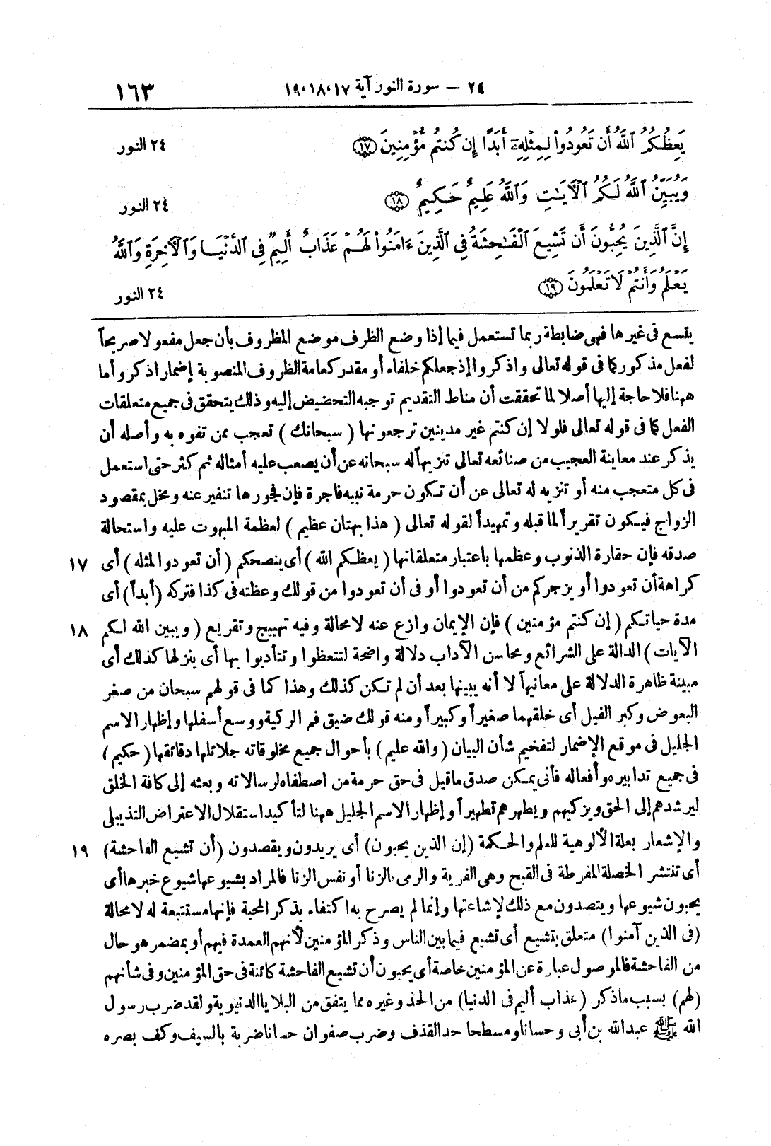 سورة النور (1719) يتَّسعُ في غيرِها فهي ضابطة ربما تستعمل فيماإذا وضع الظَّرفُ موضعَ المظروفِ بأن ج مفعولاً صريحاً لفعلٍ مذكورٍ كما في قوله تعالى واذكروا إذا جَعَلَكُمْ خُلَفَاء أو مقدَّرٍ كعامة الظروف المنصوبة إضمار اذكروا أما ههنا فلا حاجةَ إليها أصلاً لما تحققت أنَّ مناطَ التقديم توجبه التحضيضِ إليه وذلك يتحقَّقُ في جميع متعلقاتِ الفعلِ كما في قولِه تعالى فَلَوْلاَ إِن كُنتُمْ غَيْرَ مَدِينِينَ تَرْجِعُونَهَا {سبحانك} تعجُّبٌ ممَّن تفوَّه به وأصلُه أن يذكرُ عند معاينةِ العجيبِ من صنائعِه تعالى تنزيها له سبحانه على أنْ يصعبَ عليه أمثالُه ثمَّ كثُر حتَّى استُعملَ في كلِّ متعجَّبٍ منه أو تنزيهٌ لهُ تعالَى عن أنْ تكونَ حُرمةُ نبيِّه فاجرةً فإنَّ فجورَها تنفيرٌ عنه ومخلٌّ بمقصودِ الزَّواجِ فيكون تقريراً لمَا قبلَه وتمهيداً لقوله تعالى {هذا بهتان عظيم} لعظم المبهوتِ عليه واستحالةِ صدقِه فإنَّ حقارةَ الذُّنوبِ وعظمَها باعتبار مُتعلقاتِها