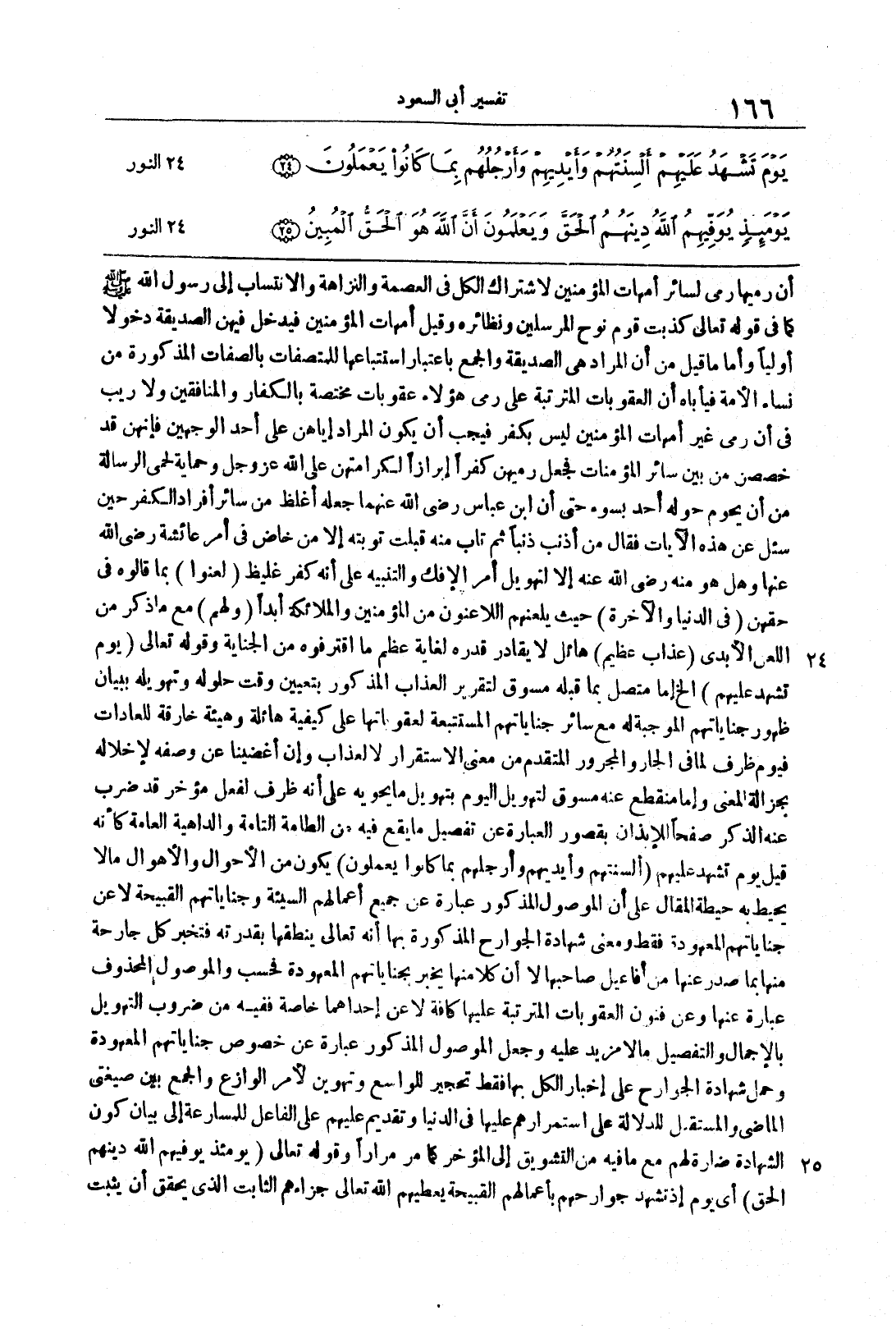 سورة النور (2425) أنَّ رميَها رميٌ لسائرِ أمَّهاتِ المُؤمنينَ لاشتراكِ الكلِّ في العصمةِ والنَّزاهةِ والانتسابِ إلى رسول الله صلى الله عليه وسلم كما في قوله تعالى كذبت قوم نوح لمرسلين ونظائرِه وقيلَ أمَّهاتُ المؤمنينَ فيدخلُ فيهن الصِّدِّيقةُ دُخولاً أوليًّا وأما ما قيل منْ أنَّ المرادَ هي الصِّدِّيقةُ والجمعُ باعتبارِ استتباعِها للمتَّصفاتِ بالصِّفاتِ المذكورةِ من نساءِ الأمةِ فيأباهُ أنَّ العقوباتِ المترتبةَ على رميِ هؤلاءِ عقوباتٌ مختصَّةٌ بالكفَّارِ والمنافقينِ ولا ريبَ في أنَّ رميَ غيرِ أمَّهاتِ المُؤمنين ليس بكفرٍ فيجبُ أن يكونَ المرادُ إيَّاهُنَّ على أحدِ الوجهينَ فإنهنَّ قد خصصنَّ من بين سائرِ المُؤمناتِ فجعل رميهنَّ كفراً إبرازاً لكرامتهنَّ على الله عزَّ وجلَّ وحمايةً مِنْ أنْ يحومَ حولَه أحد بسور حتَّى إنَّ ابنَ عبَّاسٍ رضي الله عنهما جعلَه أغلظَ من سائرِ أفرادِ الكفرِ حينَ سُئل عن هذه الآياتِ فقالَ مَن أذنبَ ذنباً ثمَّ تابَ منه قُبلت توبتُه إلا مَن خاضَ في أمر عائشةَ رضيَ الله عنها وهل هو منه رضي الله عنه إلا لتهويلِ أمرِ الإفكِ والتنبيه على أن كفرٌ غليظٌ {لُعِنُواْ} بما قالُوه في حقهنَّ {فِى الدنيا والأخرة} حيثُ يلعنُهم اللاعنونَ من المؤمنينَ والملائكةِ أبداً {وَلَهُمْ} معَ ما ذُكر من اللَّعنِ الأبديِّ {عَذَابٌ عظِيمٌ} هائلٌ لا يقادَرُ قدرُه لغاية عظمِ ما اقترفُوه من الجنايةِ وقولُه تعالى