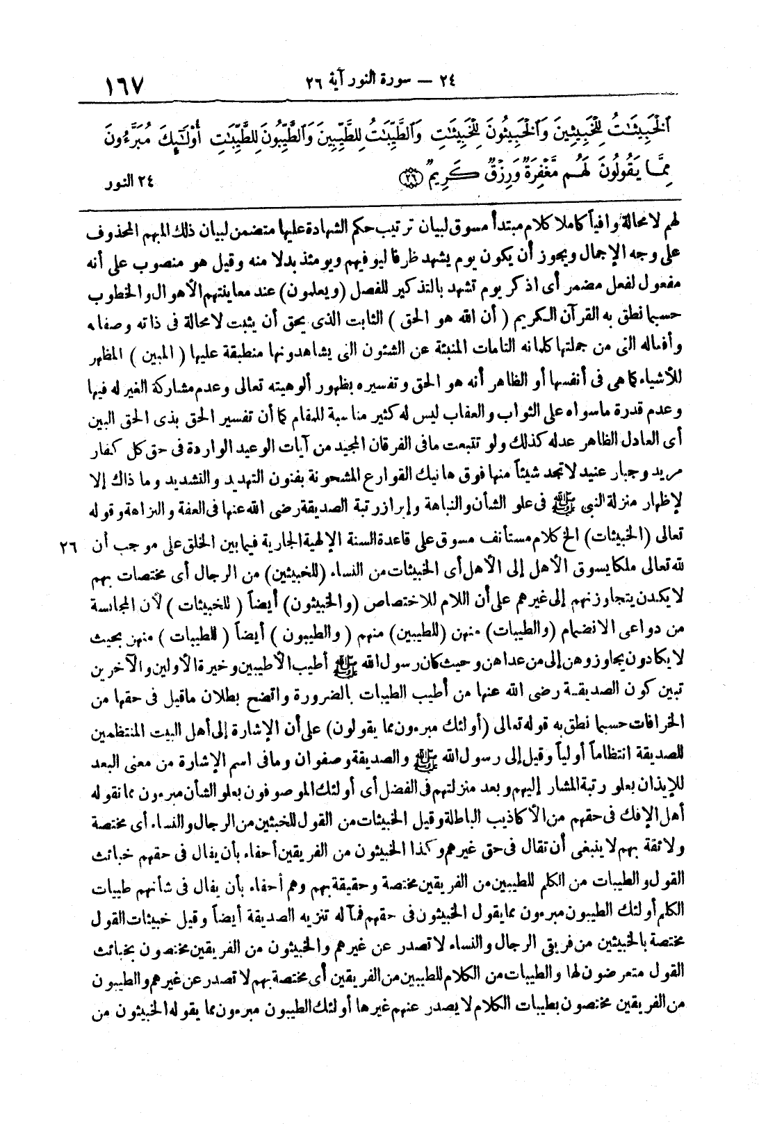 {الخبيثات} إلخ كلامٌ مستأنفٌ مسوقٌ على قاعدةِ السنةُ الإلهية الجاريةُ فيما بين الخلقِ على موجب أنَّ لله تعالى مَلَكاً يسوقُ الأهلَ إلى الأهلِ أي الخبيثاتُ من النِّساءِ {لِلْخَبِيثِينَ} من الرِّجال أي مختصَّاتٌ بهم لا يكَدْنَ يتجاوزْنَهم إلى غيرِهم على أنَّ اللامَ للاختصاصِ {والخبيثون} أيضاً {للخبيثات} لأنَّ المُجانسةَ من دَوَاعي الانضمامِ {والطيبات} منهنَّ {للطيبين} أيضا منهم {والطيبون} {للطيبات} منهنَّ بحيثُ لا يك يجاوزوهنَّ إلى من عداهنَّ وحيثُ كان رسولُ الله صلى الله عليه وسلم أطيبَ الأطيبينِ وخيرةَ الأوَّلين والآخرين تبين كونُ الصِّدِّيقةِ رضيَ الله عنَها من أطيب الطَّيباتِ بالضَّرورةِ واتَّضح بطلانُ ما قيل في حقِّها من الخُرافاتِ حسبما نطق به قوله تعالى {أولئك مبرؤون مما يقولون} عل أنَّ الإشارةَ إلى أهلِ البيتِ المنتظِمين للصِّدِّيقةِ انتظاماً أوَّليًّا وقيل إلى رسولِ الله صلى الله عليه وسلم والصِّدِّيقةِ وصفوانَ وما في إسمِ الإشارةِ من معنى البعد للإيذان بعلو رتبة المشارِ إليهم وبُعد منزلتِهم في الفضلِ أي أولئك الموصُوفون بعلُّوِ الشَّأنِ مُبرَّءون مما نقوله أهلُ الإفكِ في حقِّهم من الأكاذيبِ الباطلةِ وقيل الخبيثات من القول للخبثين من الرِّجالِ والنِّساءِ أي مختصَّة ولائقة بهم لا ينبغي أنْ تُقال في حقِّ غيرِهم وكذا الخبيثون من الفريقين أحفاء بأنْ يُقال في حقِّهم خبائثُ القول والطَّيباتُ من الكلم للطَّيبين من الفريقينِ مختصَّةٌ وحقيقة بهم وهم أحفاء بأنْ يُقال في شأنهم طيِّباتُ الكلمِ أولئك الطَّيبون مبرَّءون ممَّا يقول الخبيثون في حقِّهم فمآلُه تنزيهُ الصِّدِّيقةِ أيضاً وقيل خبيثاتُ القول مختصَّةٌ بالخبيثين من فريقَيْ الرِّجالِ والنِّساءِ لا تصدرُ عن غيرِهم والخبيثون من الفريقينِ مختصُّون بخبائث القولِ متعرِّضُون لها والطَّيباتُ من الكلام للطَّيبين من الفريقينِ أي مختصَّةٌ بهم لا تصدرُ عن غيرِهم والطَّيبون من الفريقينِ مختصُّون بطيِّباتِ الكلامِ لا يصدرُ عنهم غيرُها أولئك الطَّيبون مبرَّءون ممَّا يقولُه الخبيثون من