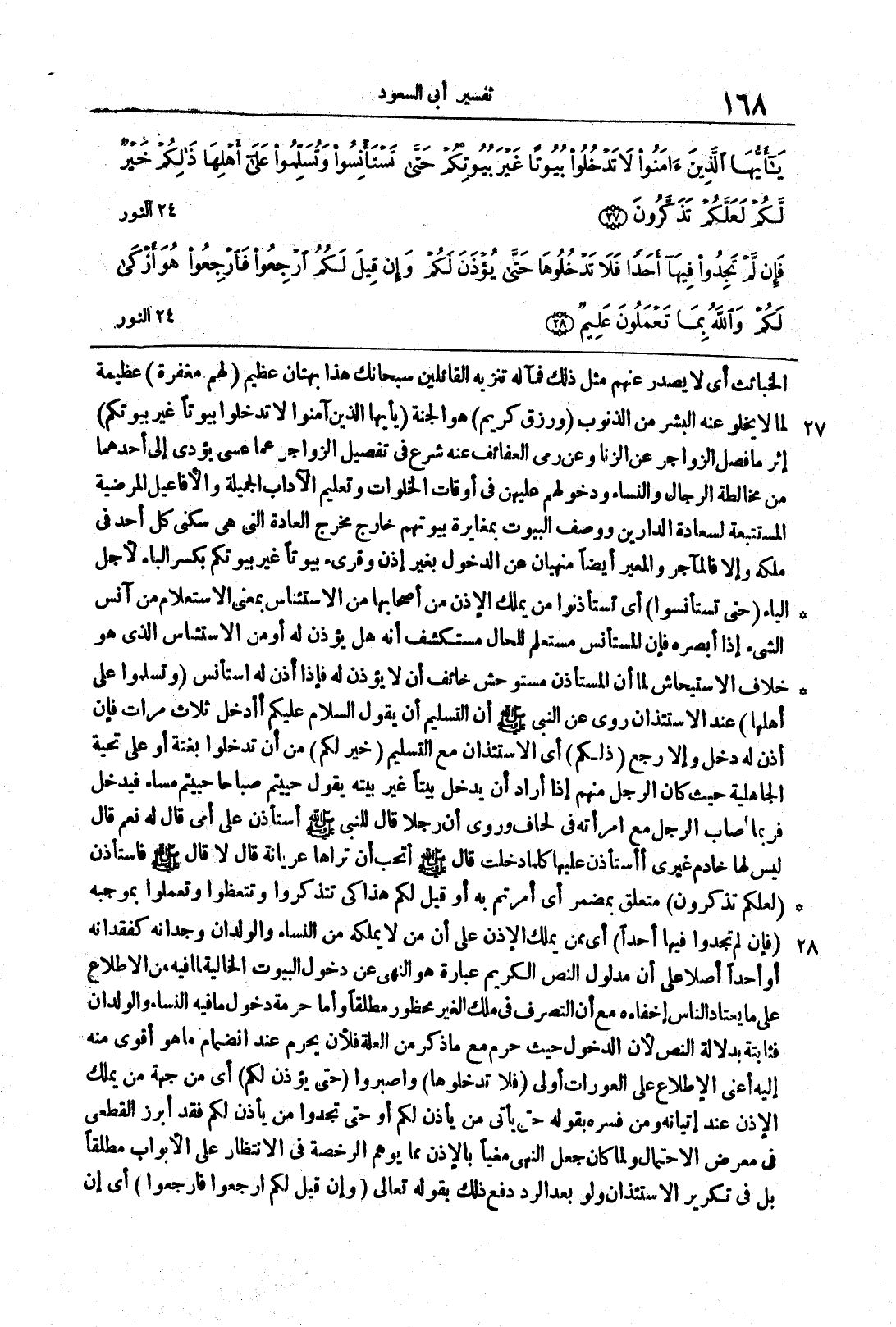 {يَا أَيُّهَا الذينَ آمَنُواْ لاَ تَدْخُلُواْ بُيُوتاً غَيْرَ بُيُوتِكُمْ} إثرَ ما فُصل عن الزِّنا وعن رميِ العفائف عنه شُرع في تفصيل الزَّواجر عمَّا عسى يُؤدِّي إلى أحدهما من مخالطة الرجال والنساء ودخولِهم عليهنَّ في أوقات الخلوات وتعليمِ الآدابِ الجميلة والأفاعيل المرضيَّة المستتبعة لسعادةِ الدَّارين ووصف البيوت بمغايرة بيوتِهم خارجٌ مخرجَ العادة التي هي سُكنى كلِّ أحدٍ في ملكه وإلا فالمآجر والمُعير أيضاٌ منهيَّانِ عن الدخول بغير إذن وقرئ بِيوتاً غيرَ بِيوتكم بكسرِ الباءِ لإجلِ الياءِ {حتى تَسْتَأْنِسُواْ} أي تستأذنوا مَن يملكُ الإذن من أصحابها من الاستئناس بمعنى الاستعلام من آنس الشيء إذا أبصره فإن المستأنس مستعلم للحال مستكشف أنه هل يؤذن له أو من الستئساس الذي هو خلاف الاستيحاش لما أن المستأذن مستوحش خائف أن لا يؤذن له فإذا أذن له استأنس {وَتُسَلّمُواْ على أَهْلِهَا} عند الاستئذان روي عنِ النبيِّ صلَّى الله عليه وسلم أن التسليم أن يقول السلام عليكم أأدخل ثلاث مرات فإن أذن له دخل وإلا رجع {ذلكم} أي الاستئذان مع التسليم {خَيْرٌ لَّكُمْ} من أن تدخلوا بغتة أو على تحية الجاهلية حيث كانَ الرجلُ منهُم إذَا أراد أن يدخل بيتاً غير بيته يقول حييتم صباحاً حييتم مساء فيدخل فربما أصاب الرجل مع امرأته في لحاف وروي أن رجلا قال للنبي صلى الله عليه وسلم أستأذن على أمي قال له نعم قال ليس لها خادم غيري أأستأذن عليها كما دخلت قال صلى الله عليه وسلم أتحب أن تراها عريانة قال لا قال صلى الله عليه وسلم فاستأذن {لَعَلَّكُمْ تَذَكَّرُونَ} متعلق بمضمر أي أمرتم به أو قيل لكم هذا كي تتذكروا وتتعظوا وتعملوا بموجبه