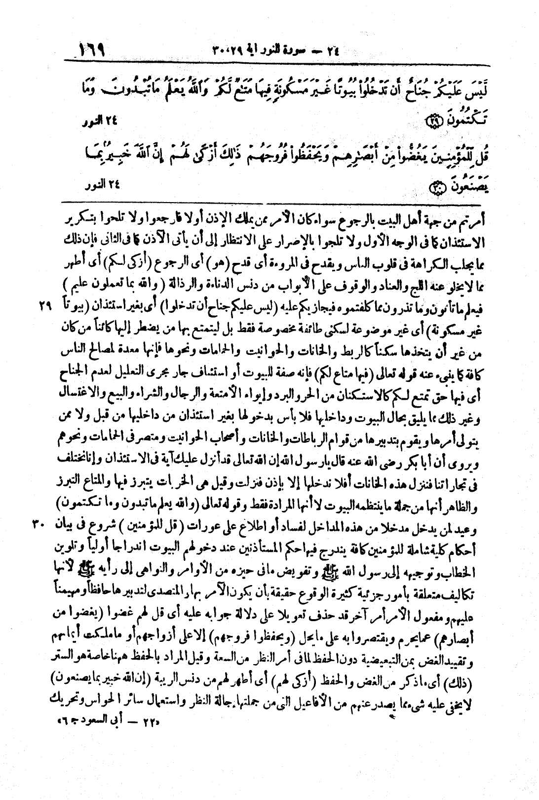 سورة النور (29 30) أُمرتم من جهةِ أهلِ البيتِ بالرُّجوع سواء كان الأمرُ ممَّن يملكُ الإذن أولا فارجعُوا ولا تلحّوا بتكرير الاستئذانِ كما في الوجهِ الأول ولا تلجوا بالإصرار على الانتظار إلى أنْ يأتيَ الآذنُ كما في الثَّاني فإنَّ ذلك ممَّا يجلبُ الكراهةَ في قلوب النَّاسِ ويقدحُ في المروءةِ أيَّ قدحٍ {هُوَ} أي الرُّجوعُ {أزكى لَكُمْ} أي أظهر مما لا يخلوا عنه اللجُّ والعناد والوقوف على الأبواب من دنس الدناءةِ والرَّذالة {والله بِمَا تَعْمَلُونَ عَلِيمٌ} فيعلم ما تأتونَ وما تذرونَ ممَّا كلفتموه فيجازيكم عليه