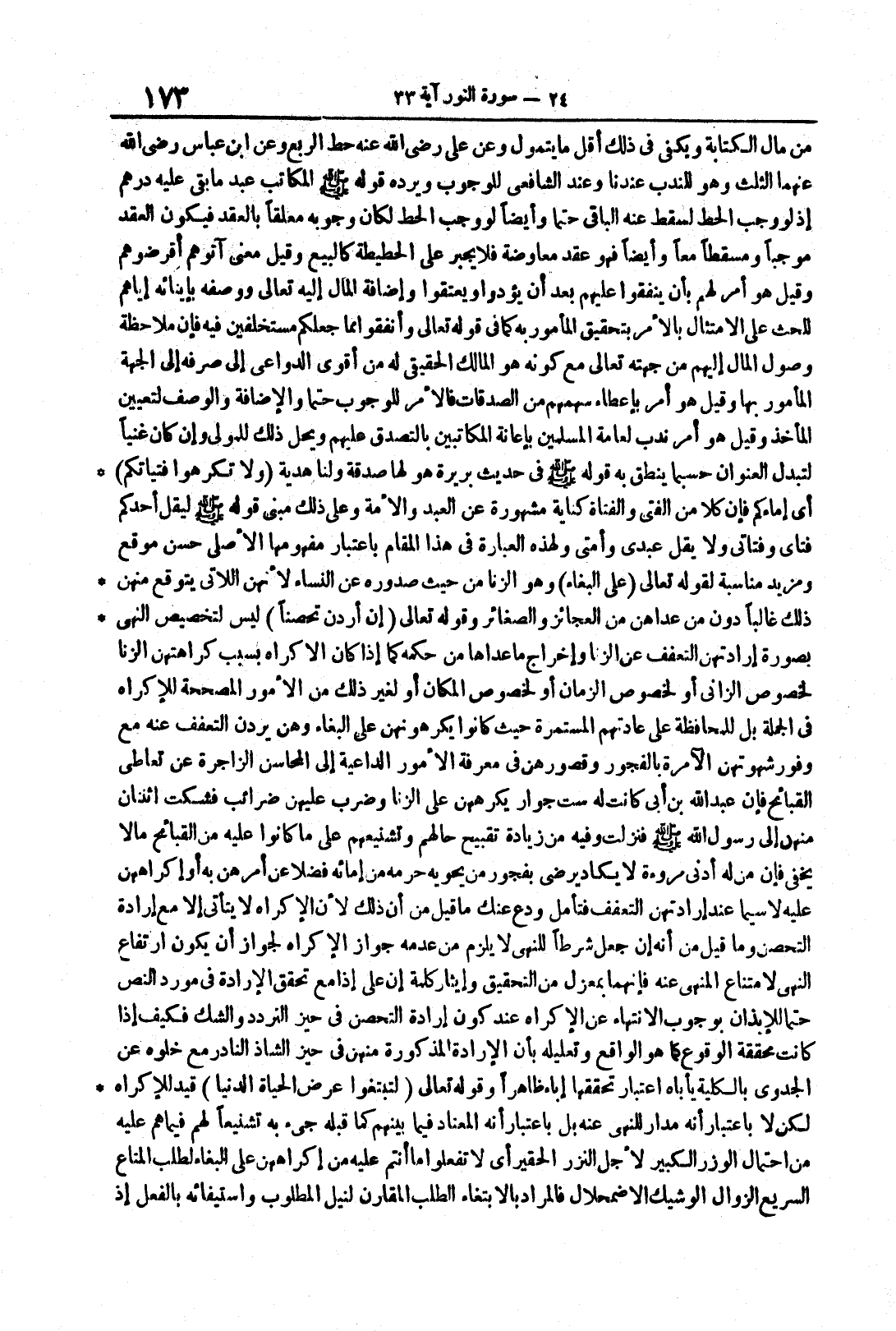 من مال الكتابة ويكفي في ذلك أقلُّ ما يتمول وعَنْ عليَ رضيَ الله عنه حطُّ الرُّبع وعن ابن عباس رضي الله عنهما الثُّلثُ وهو للنَّدبِ عندنا وعند الشافعيِّ للوجوبِ ويردُّه قوله صلى الله عليه وسلم المُكاتَبُ عبدٌ ما بقي عليه درهم إذا لو وجب الحطُّ لسقط عنه الباقي حتماً وأيضاً لو وَجَب الحطُّ لكان وجوبُه معلَّقاً بالعقد فيكون العقد مُوجِباً ومُسقِطاً معاً وأيضاً فهو عقدُ مُعاوضةٍ فلا يُجبر على الحَطيطةِ كالبيع وقيل معنى آتُوهم أقرِضُوهم وقيل هو أمرٌ لهم بأنْ يُنفقوا عليهم بعد أنْ يؤدُّوا ويعتقوا وإضافةُ المال إليه تعالى ووصفه بإينائه إيَّاهم للحثِّ على الامتثال بالأمر بتحقيق المأمور به كما في قوله تعالى وَأَنفِقُواْ مِمَّا جَعَلَكُم مُّسْتَخْلَفِينَ فِيهِ فإنَّ ملاحظة وصولِ المال إليهم من جهته تعالى مع كونه هو المالكَ الحقيقيَّ له من أَقْوى الدَّواعي إلى صرفه إلى الجهة المأمور بها وقيل هو أمرٌ بإعطاءِ سهمهِم من الصَّدقات فالأمرُ للوجوبِ حَتْماً والإضافةُ والوصفُ لتعيين المأخذِ وقيل هو أمرُ ندبٍ لعامَّة المسلمين بإعانة المُكاتبين بالتَّصدق عليهم ويحلُّ ذلك للمولى وإنْ كان غنيًّا لتبدل العُنوان حسبما ينطِق به قوله صلى الله عليه وسلم في حديثِ بَريرةَ هو لها صدقةٌ ولنا هديَّةٌ {وَلاَ تُكْرِهُواْ فتياتكم} أي إماءكم فإنَّ كُلاَّ من الفَتَى والفَتاةِ كنايةٌ مشهورةٌ عن العبدِ والأمَةِ وعلى ذلك مبنى قوله صلى الله عليه وسلم ليقُلْ أحدُكم فتاي وفتاتي ولا يقُل عبدي وأمَتي لهذه العبارةِ في هذا المقامِ باعتبار مفهومِها الأصلي حسنُ موقعٍ ومزيدُ مناسبةٍ لقولهِ تعالى {عَلَى البغاء} وهو الزِّنا من حيثُ صدورُه عن النساءِ لأنهنَّ اللاَّتي يُتوقَّع منهنَّ ذلك غالباً دُون مَن عداهنَّ من العجائزِ والصَّغائرِ وقولُه تعالى {إِنْ أَرَدْنَ تَحَصُّناً} ليس لتخصيص النَّهي بصورة إرادتهِنَّ التَّعففَ عن الزِّنا وإخراجِ ما عداها من حُكمه كما إذا كان الإكراه بسبب كراهتهنَّ الزِّنا لخصوصِ الزَّاني أو لخصوصِ الزَّمانِ أو لخصوصِ المكانِ أو لغيرِ ذلكَ من الأُمور المُصحِّحةِ للإكراه في الجُملةِ بل للمحافظةِ على عادتهم المستمرَّة حيثُ كانُوا يكرهونهنَّ على البغاء وهنَّ يُردن التَّعففَ عنه مع وفورِ شهوتهنَّ الآمرةِ بالفُجورِ وقصورهنَّ في معرفةِ الأمورِ الدَّاعيةِ إلى المحاسنِ الزَّاجرةِ عن تَعَاطي القبائحِ فإنَّ عبدَ اللَّهِ بنَ أُبيَ كانت له ست جوار يكرهن على الزِّنا وضربَ عليهنَّ ضرائبَ فشكتِ اثنتانِ منهنَّ إلى رسول الله صلى الله عليه وسلم فنزلتْ وفيهِ من زيادةِ تقبيحِ حالهم وتشنيعهِم على ما كانُوا عليهِ من القبائحِ ما لا يَخْفى فإنَّ مَن له أدنى مروءةٍ لا يكادُ يرضى بفجور من يحويهِ حرمُه من إمائهِ فضلاً عن أمرهن به أو إكراهن عليه لا سيما إرادتهنَّ التَّعففَ فتأمَّلْ ودَعْ عنكَ ما قيلَ من أنَّ ذلكَ لأنَّ الإكراه لا يتأتَّى إلا مع إرادة التَّحصُّنِ وما قيل من أنَّه إنْ جُعل شرطاً للنَّهي لا يلزم من عدمِه جوازُ الإكراه لجوازِ أنْ يكون ارتفاعُ ئالنهى لامتناع المنهيِّ عنه فإنَّهما بمعزلٍ من التَّحقيق وإيثار كلمةِ إنْ على إذا مع تحقُّق الإرادةِ في موردِ النَّصِّ حتماً للإيذانِ بوجوبِ الانتهاء عن الإكراه عند كونِ إرادةِ التَّحصنِ في حيِّز التَّردد والشَّكِّ فكيفَ إذا كانت مُحقَّقة الوقوع كما هو الواقعُ وتعليلُه بأنَّ الإرادةَ المذكورة منهنَّ في حيِّز الشَّاذ النادرِ مع خُلوه عن الجَدْوى بالكُلِّية يأباهُ اعتبارُ تحققها إباء ظاهرا تعالى {لّتَبْتَغُواْ عَرَضَ الحياة الدنيا} قيدٌ للإكراه لكنْ لا باعتبارِ أنَّه مدارٌ النهى عنه باعتبار أنَّه المعتادُ فيما بينهم كما قبله لهُم فيما هُم عليه من احتمال الوزرِ الكبيرِ لأجل النَّزْرِ الحقيرِ أي لا تفعلُوا ما أنتُم عليه من إكراههنَّ على البغاءِ لطلب المتاعِ السَّريعِ الزَّوالِ الوشيكِ الاضمحلالِ فالمرادُ بالابتغاء الطَّ