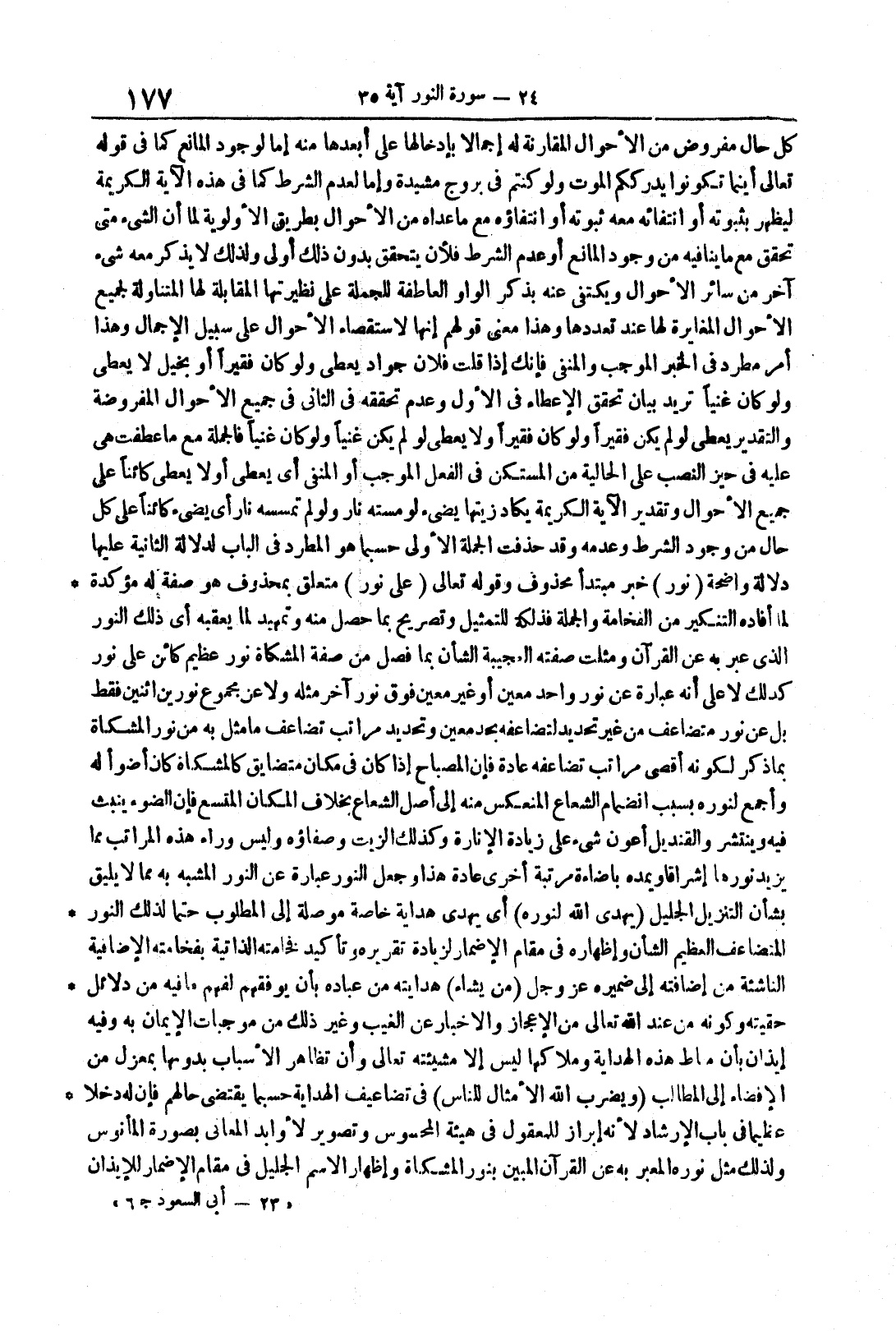 كل حالٍ مفروض من الأحوال المُقارنة له إجمالاً بإدخالها على أبعدها منه إما لوجودِ المانع كما في قولِه تعالى أَيْنَمَا تَكُونُواْ يُدْرِككُّمُ الموت وَلَوْ كُنتُمْ فِى بُرُوجٍ مُّشَيَّدَةٍ وإما لعدم الشَّرط كما في هذه الآية الكريمة ليظهرَ بثبوته أو انتفائِه معه ثبوتُه أو انتفاؤُه مع عداه من الأحوال بطريق الأولوية لما أن الشيءَ متى تحقَّقَ مع ما ينافيه من وجود المانعِ أو عدم الشَّرطِ فلأنْ يتحققَ بدون ذلك أولى ولذلك لا يُذكر معه شيءٌ آخرُ من سائر الأحوال ويكتفى عنه بذكر الواو العاطفةِ للجملة عل نظيرتها المقابلةِ لها المتناولة لجميع الأحوالِ المغايرةِ لها عند تعدّدِها وهذا معنى قولِهم أنها لاستقصاء الأحوالِ على سبيلِ الإجمالِ وهذا أمر مطَّرد في الخبر الموجَبِ والمنفيِّ فإنَّك إذا قلت فلانٌ جوادٌ يُعطي ولو كان فقيراً أو بخيلٌ لا يُعطي ولو كان غنيًّا تريد بيان تحقُّقِ الإعطاء في الأوَّلِ وعدم تحقُّقِه في الثَّانِي في جميع الأحوال المفروضة والتَّقديرُ يُعطي لو لم يكنْ فَقيراً ولو كان فقيراً ولا يُعطي لو لم يكن غنيا ولو كان غنيًّا فالجملة مع ما عُطفت هي عليه في حيز النصبِ على الحاليةِ من المستكنِّ في الفعل الموجب أو المنفيِّ أي يعطى أولا يُعطي كائناً على جميعِ الأحوال وتقديرُ الآية الكريمة يكادُ زيتُها يضيءُ لو مسَّته نارٌ ولو لم تمسه نارٌ أي يضيءُ كائناً على كل حال من وجود الشَّرطِ وعدمه وقد حُذفت الجملةُ الأولى حسبما هو المطَّردُ في الباب لدلالة الثَّانيةِ عليها دلالةً واضحةً {نُورٍ} خبرُ مبتدأٍ محذوفٍ وقولُه تعالى {على نُورٍ} متعلِّق بمحذوفٍ هو صفةٌ له مؤكدةٌ لما أفاده التنكيرُ من الفخامة والجملة فَذْلكةٌ للتَّمثيل وتصريحٌ بما حصلَ منه وتمهيدٌ لما يعقبه أي ذلك النُّور الذي عُبِّر به عن القرآن ومُثِّلتْ صفتُه العجيبةُ الشَّأنِ بما فُصِّل من صفة المشكاة نورٌ عظيمٌ كائن على نور كذلك لا على أنَّه عبارةٌ عن نور واجد معيَّن أو غير معيَّنٍ فوق نور آخرَ مثله ولا عن مجموع نورينِ اثنينِ فقط بل عن نورٍ مُتضاعفٍ من غير تحديد لتضاعفه بحدَ مُعيَّنٍ وتحديدُ مراتبِ تضاعُف ما مُثّل به من نورِ المشكاةِ بما ذُكر لكونِه أقصى مراتب تضاعفِه عادةً فإنَّ المصباحَ إذا كان في مكانٍ متضايق كالمشكاةِ كان أضوأَ له وأجمعَ لنورِه بسبب انضمامِ الشُّعاعِ المنعكس منه إلى أصلِ الشُّعاعِ بخلاف المكان المتَّسعِ فإنَّ الضَّوءَ ينبثُّ فيه وينتشرُ والقنديل أعونُ شيءٍ على الزيادة الإنارة وكذلك الزي وصفاؤه وليس وراء هذه المراتبِ ممَّا يزيد نورَها إشراقاً ويمدُّه بإضاءةٍ مرتبةٌ أُخرى عادةً هذا وجعل النُّورِ عبارةً عن النُّورِ المشبه به مما لا يليق بشأن التنزيل الجليل {يَهْدِى الله لِنُورِهِ} أي يَهْدِى هدايةً خاصَّةً موصِلةً إلى المطلوب حتماً لذلك النُّور المتضاعف العظيمِ الشَّأنِ وإظهارُه في مقام الإضمارِ لزيادة تقريرِه وتأكيدِ فخامتِه الذَّاتيَّةِ بفخامتِه الإضافيةِ النَّاشئةِ من إضافتِه إلى ضميره عزَّ وجلَّ {مَن يَشَآء} هدايتَه من عباده بأنْ يوفِّقَهم لفهم مَا فيهِ منْ دلائلِ حقِّيتِه وكونِه من عندِ الله تعالى من الإعجاز والإخبارِ عن الغيبِ وغير ذلك من مُوجباتِ الإيمانِ به وفيه إيذانٌ بأنَّ ماط هذه الهدايةِ ومِلاكَها ليس إلا مشيئتَه تعالى وأنَّ تظاهرَ الأسباب بدونها بمعزلٍ من الإفضاء إلى المطالب {وَيَضْرِبُ الله الأمثال لِلنَّاسِ} في تضاعيف الهداية حسبَما يقتضِي حالُهم فإنَّ له دخلاً عظيماً في باب الإرشاد لأنه إبرار للمعقول في هيئة المحسوس وتصويرٌ لأوابدِ المعاني بصورة المأنُوسِ ولذلك مُثّل نورُه المعبد به عن القُرآن المُبين بنور المشكاة وإظفاره الاسمِ الجليلِ في مقام الإضمار للإيذان