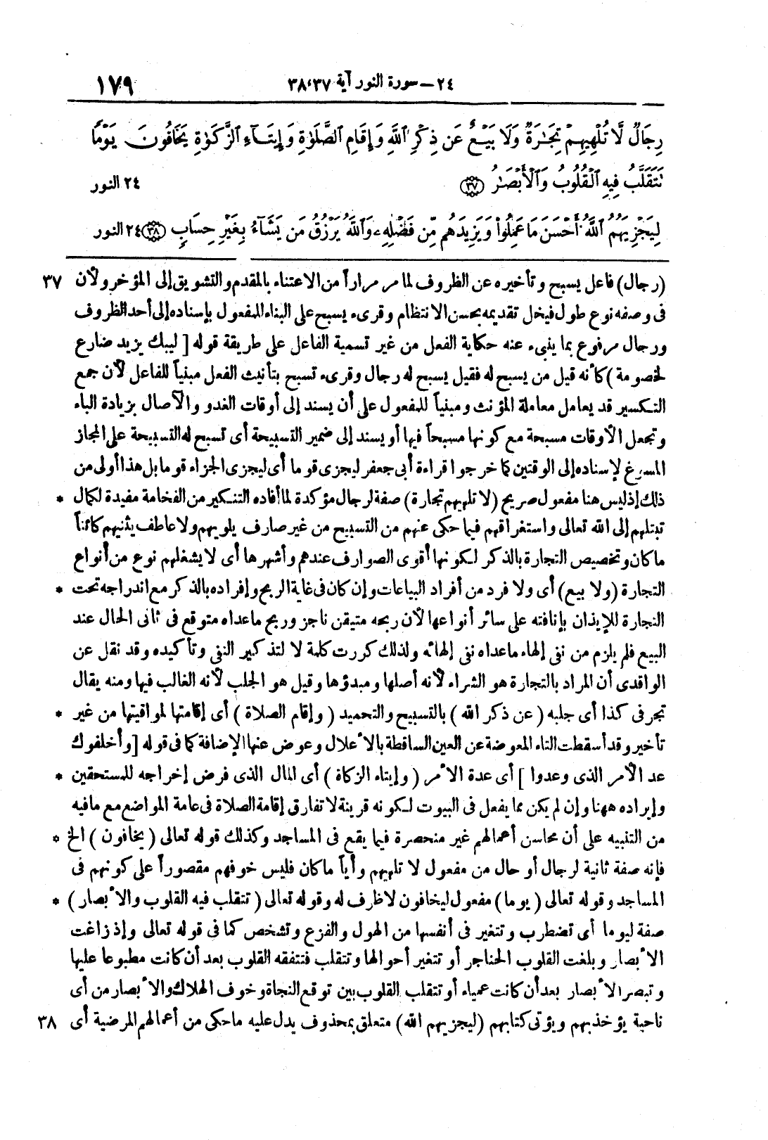 {رِجَالٌ} فاعلُ يسبِّح وتأخيرُه عن الظُّروفِ لما مرَّ مرارا من الاعتناء بالمقدم والتَّشويق إلى المؤخَّر ولأنَّ في وصفِه نوعَ طُولٍ فيُخلُّ تقديمُه بحسن الانتظام وقرئ يُسبِّح على البناء للمفعول بإسناده إلى أحد الظُّروف ورحال مرفوع بما ينبئ عنه حكايةُ الفعلِ من غير تسميةِ الفاعل على طريقة قوله لبيك يزيدُ ضارعٌ لخصومةٍ كأنه قيل مَنْ يُسبِّح له فقيل يُسبِّح له رجالٌ وقرئ تُسبِّح بتأنيثِ الفعلِ مبنيًّا للفاعلِ لأنَّ جمعَ التَّكسيرِ قد يُعامل معاملةَ المؤنَّثِ ومبنياً للمفعول على أنْ يسند إلى أوقات الغدو والآصالِ بزيادة الباءِ وتجعلُ الأوقاتُ مسبِّحةً مع كونِها مسبحا فيها أو يُسند إلى ضمير التسبيحة أي تسبيح له التَّسبيحةُ على المجازِ المسوِّغ لإسناده إلى الوقتينِ كما خرَّجُوا قراءة أبي جَعفرٍ ليُجزَى قوماً أي ليُجزَى الجزاءُ قَوْماً بل هذا أولى من ذل هنا مفعولٌ صريحٌ {لاَّ تُلْهِيهِمْ تجارة} صفةٌ لرجالٌ مؤكدةٌ لما أفاده التنكيرُ من الفخامةِ مفيدةٌ لكمال تبتُّلِهم إلى الله تعالى واستغراقهم فيها حُكي عنهم من التَّسبيحِ من غير صارف يلويهم ولا عاطفٍ يثنيهم كائناً ما كان وتخصيصُ التِّجارةِ بالذكر لكونهما أقوى الصَّوارفِ عندهم وأشهرَها أي لا يشغلُهم نوعٌ من أنواعِ التِّجارةِ {وَلاَ بَيْعٌ} أي ولا فردٌ من أفراد البياعاتِ وإنْ كانَ في غايةِ الرِّبحِ وإفرادُه بالذِّكرِ مع اندراجِه تحتَ التِّجارة للإيذانِ بإنافتِه على سائرِ أنواعِها لأنَّ ربحَهُ متيقَّنٌ ناجزٌ وربحُ ما عداه متوقَّعٌ في الثاني الحال عند البيع فلم يلزمْ من نفيِ إلهاءِ ما عداه نفيُ إلهائِه ولذلك كُرِّرت كلمةُ لا لتذكيرِ النَّفيِ وتأكيدِه وقد نُقل عن الواقديِّ أنَّ المرادَ بالتِّجارة هو الشِّراءُ لأنَّه أصلُها ومبدؤها وقيل هو الجَلَبُ لأنَّه الغالبُ فيها ومنه يُقال تَجَر في كَذا أي جَلَبه {عَن ذِكْرِ الله} بالتَّسبيحِ والتَّحميدِ {وإِقَامِ الصلاة} أي إقامتِها لمواقيتها من غير تأخيرٍ وقد أُسقطتْ التَّاءُ المعوض عن العينِ السَّاقطةِ بالإعلال وعُوِّض عنها الإضافةُ كما في قوله [وَأَخْلفُوك عِدَ الأمرِ الذي وَعدُوا] أي عدة الأمر {وإيتاء الزكاة} أي المال الذي فُرض إخراجه للمستحقين وإيراده ههنا وإنْ لم يكن ممَّا يُفعل في البيوت لكونِه قرينةً لا تُفارق إقامةَ الصَّلاةِ في عامَّة المواضع مع ما فيه من التَّنبيه على أنَّ محاسنَ أعمالِهم غيرُ منحصرةٍ فيما يقعُ في المساجدِ وكذلك قوله تعالى {يَخَافُونَ} الخ فإنه صفةٌ ثانيةٌ لرجالٌ أو حالٌ من مفعول لا تُلهيهم وأيًّا ما كان فليس خوفُهم مقصُوراً على كونِهم في المساجد وقوله تعالى {يَوْماً} مفعولُ ليخافون لا ظرفٌ له وقولُه تعالى {تَتَقَلَّبُ فِيهِ القلوب والأبصار} صفةٌ ليوماً أي تضطربُ وتتغيرُ في أنفسها من الهول والفزعِ وتشخصُ كما في قولِه تعالى وإذ زاغت والأبصار وَبَلَغَتِ القلوب الحناجر أو تتغيرُ أحوالُها وتتقلَّب فتتفقّه القلوبُ بعد أن كانتْ مطبوعاً عليها وتُبصر الأبصارُ بعد أنْ كانت عمياءَ أو تتقلَّب القلوبُ بين توقع النجارة وخوفِ الهلاكِ والإبصار من أيِّ ناحيةٍ يُؤخذ بهم ويُؤتى كتابُهم