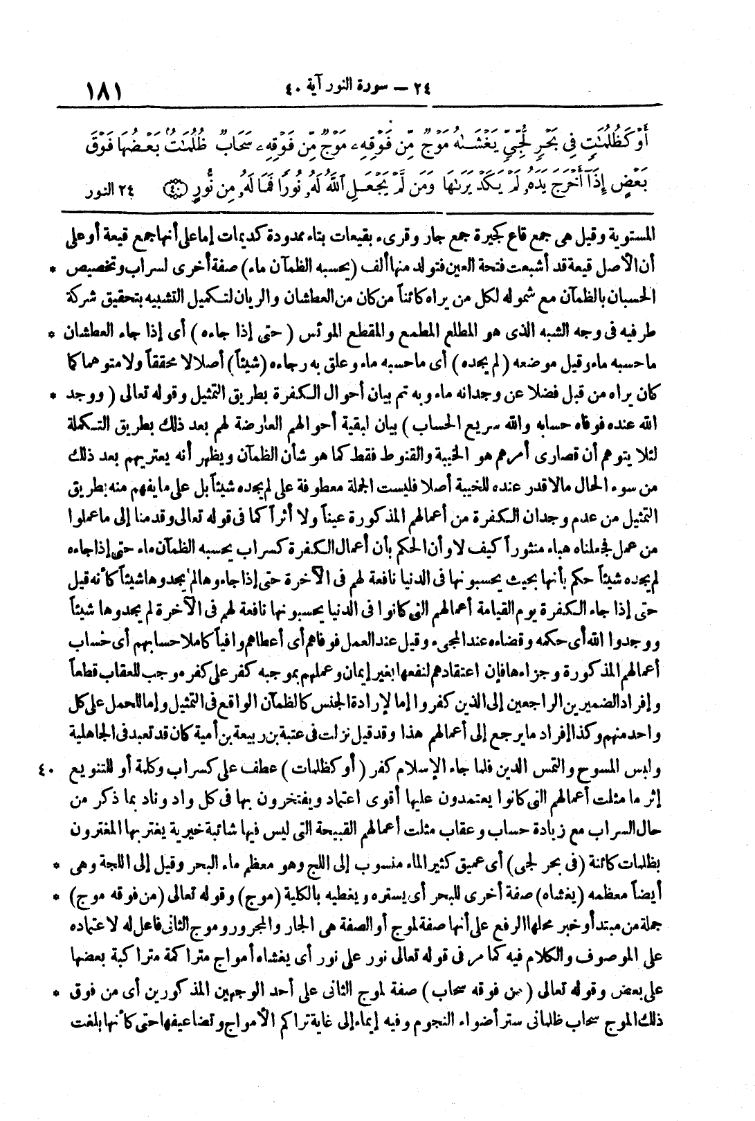 سورة النور (40) المستويةُ وقيل هي جمعُ قاعٍ كجيرة جمعُ جارٍ وقُرىء بقيعاتٍ بتاء ممدودةٍ كديماتٍ إمَّا على أنَّها جمعُ قيعةٍ أو على أنَّ الأصلَ قيعة قد أُشبعت فتحةُ العينِ فتولَّد منها ألِفٌ {يَحْسَبُهُ الظمان مَاء} صفةٌ أخرى لسرابٍ وتخصيص الحسبان بالظَّمآن مع شموله لكلِّ مَن يراه كائنا من كان من العطشانِ والريَّانِ لتكميل التَّشبيهِ بتحقيق شركة طرفيه في وجهِ الشَّبهِ الذي هو المطلع المطمع والمقطع الموئس {حتى إذا جاءه} أي إذا جاءَ العطشانُ ما حَسِبَه ماءً وقيل موضعَه {لَمْ يَجِدْهُ} أي ما حسبَه ماءً وعلَّق به رجاءه {شيئا} أصلالا محقَّقاً ولا متوهَّماً كما كان يراهُ من قبلُ فضلاً عن وجدانه ماء وبه تمَّ بيانُ أحوالِ الكفرة بطريق التَّمثيل وقوله تعالى {وَوَجَدَ الله عِندَهُ فوفاه حِسَابَهُ والله سَرِيعُ الحساب} بيانٌ لبقيَّة أحوالِهم العارضة لهم بعد ذلك بطريقِ التَّكملة لئلاَّ يتوَّهم أنَّ قُصارى أمرِهم هو الخيبةُ والقنوط فقطْ كما هُوَ شأنُ الظَّمآنِ ويظهر أنَّه يعتريهم بعد ذلك التَّمثيل من عدمِ وجدان الكَفَرةِ من أعمالِهم المذكُورةِ عيناً ولا أثراً كما في قوله تعالى وَقَدِمْنَا إلى مَا عَمِلُواْ مِنْ عَمَلٍ فَجَعَلْنَاهُ هَبَاء مَّنثُوراً كيف لا وأنَّ الحكم بأنَّ أعمالَ الكَفَرة كسرابٍ يحسبه الظمآنُ ماء حتَّى إذا جاءه لم يجدُه سيئا حكمٌ بأنَّها بحيث يحسبونَها في الدُّنيا نافعةً لهم في الآخرة حتَّى إذا جاءوها لم يجدُوها شيئاً كأنه قيل حتى إذا جاء الكَفَرةُ يومَ القيامةِ أعمالَهم التي كانُوا في الدُّنيا يحسبونها نافعةً لهم في الآخرة يجدُوها شيئاً ووجدُوا الله أي حكمَهُ وقضاءَهُ عند المجيءِ وقيل عند العملِ فوفَّاهم أي أعطاهُم وافياً كاملاً حسابَهم أي حسابَ أعمالِهم المذكورةِ وجزاءها فإنَّ اعتقادَهم لنفعها بغير إيمانٍ وعملهم بموجبه كفرٌ على كفره وجب للعقاب قطا وإفرادُ الضَّميرينِ الرَّاجعينِ إلى الذين كفروا إمَّا لإرادة الجنس كالضمان الواقع في التَّمثيلِ وإمَّا للحملِ على كلِّ واحدٍ منهم وكذا إفرادُ ما يرجع إلى أعمالِهم هذا وقدفيل نزل في عُتْبةُ بنُ ربيعةَ بنِ أُميَّة كان قد تعبَّد في الجاهليَّةِ وليس المسوحَ والتمسَ الدِّينَ فلمَّا جاء الإسلامُ كفرَ