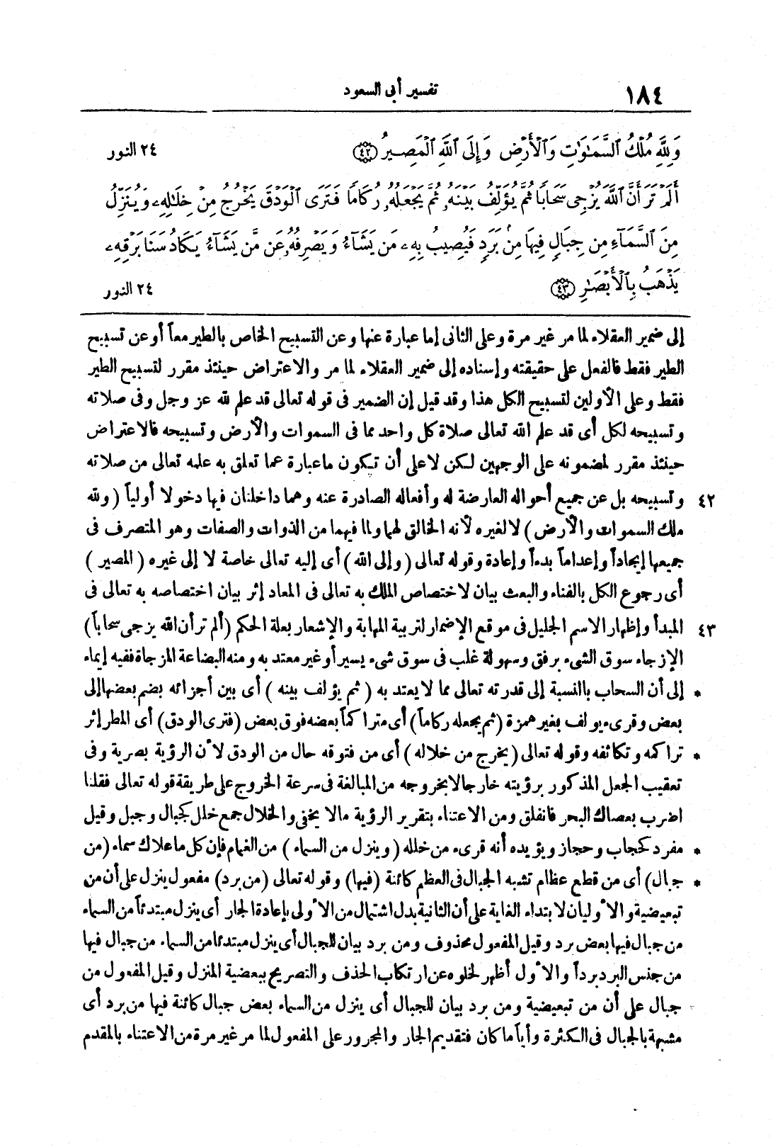 سورة النور (42 43) إلى ضميرِ العُقلاء لما مرَّ غيرَ مرَّةٍ وعلى الثَّاني إمَّا عبارة عنها عن التَّسبيح الخاصِّ بالطَّير معاً أو تسبيح الطَّيرِ فقط فالفعلُ على حقيقته وإسناده إلى ض لما مرَّ والاعتراضُ حينئذٍ مقررٌ لتسبيح الطَّيرِ فقط وعلى الأوَّلينِ لتسبيح الكلِّ هذا وقد قيلَ إنَّ الضَّمير في قولِه تعالى وقد علم الله عز وجل وفي صلاته وتسبيحه لكلٌّ أي قدْ علَم الله تعالَى صلاةَ كلِّ واحدٍ مما في السماوات والأرضِ وتسبيحه فالاعتراضُ حينئذٍ مقررٌ لمضمونه على الوجهينِ لكن لأعلى أنْ تكونَ ما عبارةً عمَّا تعلَّق به علمُه تعالى من صلاتِه وتسبيحِه بل عن جميع أحوالِه العارضةِ له وأفعاله الصَّادرةِ عنه وهما داخلتانِ فيها دخولاً أوليًّا