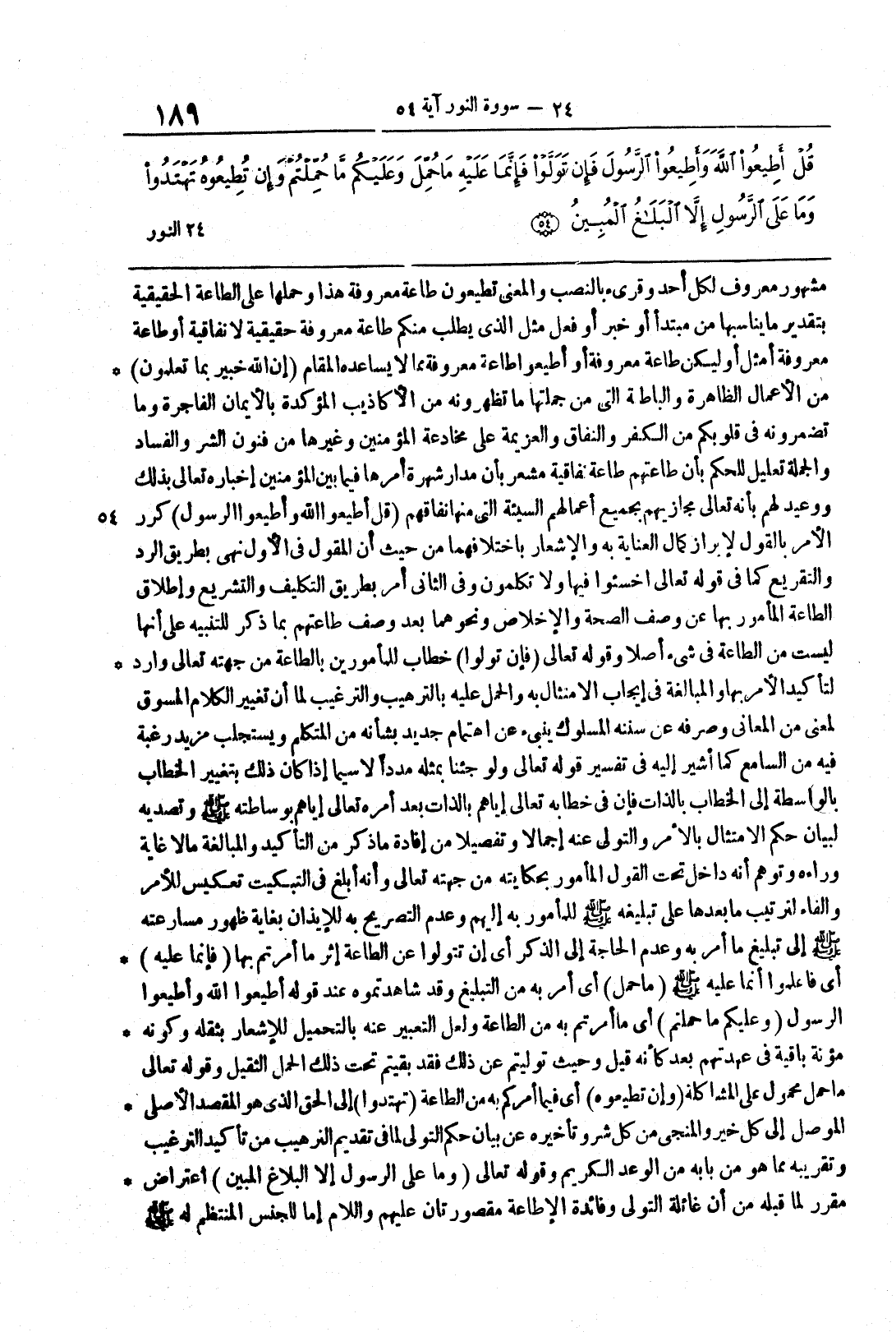 {قُلْ أَطِيعُواْ اللَّهَ وَأَطِيعُواْ الرسول} كرَّر الأمرَ بالقول لإبراز كمالِ العنايةِ به والإشعارِ باختلافهما من حيثُ أنَّ المقولَ في الأوَّلِ نهيٌ بطريق الردِّ والتَّقريعِ كما في قوله تعالى {اخسؤوا فِيهَا وَلاَ تُكَلّمُونِ} وفي الثَّاني أمرٌ بطريقِ التَّكليفِ والتَّشريعِ وإطلاقُ الطَّاعة المأمورِ بها عن وصفِ الصحَّةِ والإخلاصِ ونحوهما بعد وصف طاعتهم بما ذُكر للتَّنبيه على أنَّها ليستْ من الطَّاعةِ في شيءٍ أصلاً وقوله تعالى {فَإِن تَوَلَّوْاْ} خطابٌ للمأمورين بالطَّاعةِ من جهتِه تعالى واردٌ لتأكيد الأمر بها والمبالغةِ في إيجاب الامتثال به والحملِ عليه بالتَّرهيب والتَّرغيبِ لما أنَّ تغييرَ الكلامِ المَسوقِ لمعنى من المعاني وصَرْفَه عن سننه المسلوك ينبئ عن اهتمامٍ جديدٍ بشأنه من المتكلِّم ويستجلبُ مزيدَ رغبةٍ فيه من السَّامعِ كما أشير إليه في تفسيرِ قولِه تعالى {وَلَوْ جِئْنَا بِمِثْلِهِ مَدَداً} لا سيَّما إذا كان ذلك بتغيير الخطابِ بالواسطةِ إلى الخطابِ بالذَّاتِ فإنَّ في خطابِه تعالى إيَّاهم بالذَّات بعد أمرِه تعالى إيَّاهم بوساطته صلى الله عليه وسلم وتصدِّيه لبيان حُكمِ الامتثالِ بالأمر والتولِّي عنه إجمالاً وتفصيلاً من إفادةِ ما ذُكر من التَّأكيدِ والمُبالغةِ ما لا غايةَ وراءَه وتَوهُّم أنَّه داخلٌ تحت القولِ المأمورِ بحكايتِه من جهته تعالى وأنَّه أبلغُ في التَّبكيتِ تعكيسٌ للأمرِ والفاءُ لترتيب ما بعدها على تبليغه صلى الله عليه وسلم للمأمور به إليهم وعدمُ التَّصريحِ به للإيذانِ بغاية ظهور مسارعته صلى الله عليه وسلم إلى تبليغ ما أُمرَ به وعدم الحاجةِ إلى الذِّكرِ أي إنْ تتولَّوا عن الطَّاعةِ إثرَ ما أُمرتم بهَا {فَإِنَّمَا عَلَيْهِ} أي فاعلمُوا أنَّما عليه صلى الله عليه وسلم {ما حمل} أي ما أُمر بهِ من التَّبليغِ وقد شاهدتمُوه عند قوله أَطِيعُواْ اللَّهَ وَأَطِيعُواْ الرسول {وَعَلَيْكُمْ مَّا حُمّلْتُمْ} أي ما أُمرتم بهِ منَ الطَّاعة ولعلَّ التَّعبيرَ عنه بالتَّحميل للإشعارِ بثقله وكونِه مُؤنةً باقيةً في عهدتِهم بعدُ كأنَّه قيل وحيثُ توليتُم عن ذلك فقد بقيتم تحت ذلك الحملِ الثَّقيلِ وقولُه تعالى مَا حُمّلَ محمولٌ على المُشاكلة {وَإِن تُطِيعُوهُ} أي فيما أَمركم به من الطَّاعةِ {تَهْتَدُواْ} إلى الحقِّ الذي هو المقصدُ الأصليُّ المُوصلُ إلى كلِّ خيرٍ والمُنجِّي من كلِّ شرَ وتأخيرُه عن بيانِ حكم التَّولِّي لما في تقديم التَّرهيبِ من تأكيد التَّرغيبِ وتقريبه ممَّا هو من بابه من الوعد الكريمِ وقولُه تعالى {وَمَا عَلَى الرسول إِلاَّ البلاغ المبين} اعتراضٌ مقرر لما قبله من أنَّ غائلةَ التولِّي وفائدة الإطاعةِ مقصورتانِ عليهم واللامُ إمَّا للجنسِ المُنتظمِ له صلى الله عليه وسلم