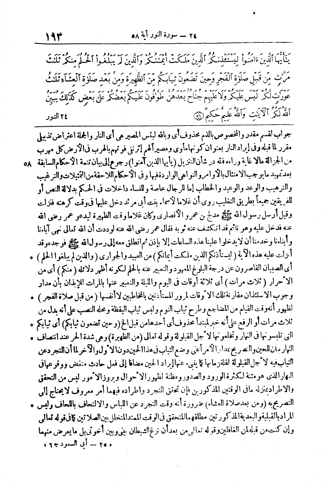 {يَا أَيُّهَا الذينَ آمَنُواْ} رجوع إلى بيان تتمةِ الأحكامِ السَّابقةِ بعد تمهيدِ ما يُوجب الامتثالَ بالأوامر والنَّواهي الواردة فيها وفي الأحكام اللاَّحقةِ من التمثيلات والتَّرغيبِ والتَّرهيبِ والوعدِ والوعيدِ والخطابُ إمَّا للرِّجالِ خاصَّةً وللنساء داخلاتٌ في الحكم بدلالة النَّصِّ أو للفريقينِ جميعاً بطريقِ التَّغليبِ رُوي أنَّ غلام الأسماء بنتِ أبي مَرْثَدٍ دخل عليها في وقتٍ كرهتْهُ فنزلتْ وقيلَ أرسلَ رسولُ الله صلى الله عليه وسلم مِدْلَجَ بنَ عمروٍ الأنصاريَّ وكانَ غُلاماً وقتَ الظَّهيرةِ ليدعو عمر رضي الله عنه فدخلَ عليه وهو نائمٌ قد انكشفَ عنه ثوبُه فقال عمرُ رضي الله عنه لودتت أنَّ الله تعالى نَهَى آباءَنا وأبناءَنا وخدمَنا أنْ لا يدخلوا علينا هذه السَّاعاتِ إلا بإذنٍ ثمَّ انطلقَ معه إلى رسولِ الله صلى الله عليه وسلم فوجدَه وقد أُنزلتْ عليه هذه الآيةُ {لِيَسْتَأْذِنكُمُ الذين مَلَكَتْ أيمانكم} من العبيدِ والجَوَاري {والذين لَمْ يَبْلُغُواْ الحلم} أي الصِّبيانُ القاصرُون عن درجة البلوغِ المعهود والتَّعبيرُ عنه بالحُلُم لكونِه أظهرَ دلائلِه مّنكُمْ أي من الأحرارِ {ثَلاَثَ مَرَّاتٍ} أي ثلاثةَ أوقاتٍ في اليَّومِ واللَّيلةِ والتَّعبيرُ عنها بالمرَّات للإيذانِ بأنَّ مدارَ وجوبِ الاستئذانِ مقارنةُ تلك الأوقاتِ لمرور المستأذنينَ بالمخاطبينَ لا أنفسِها {مّن قَبْلِ صلاة الفجر} لظهورِ أنَّه وقتُ القيامِ من المضاجعِ وطرحِ ثيابِ النَّومِ ولبسِ ثيابِ اليقظةِ ومحلُّه النصبُ على أنَّه بدل من ثلاث مرات أو مرات أو الرع على أنه خبرٌ لمبتدأ محذوفٍ أي أحدُها من قبل الخ {وَحِينَ تَضَعُونَ ثيابكم} أي ثيابَكم التي تلبسونَها في النَّهارِ وتخلعونَها لأجل القَيلولةِ وقوله تعالى {مّنَ الظهيرة} وهي شدَّةُ الحرِّ عند انتصافِ النَّهارِ بيان للحين والصريح الأمرِ أعني وضعَ الثِّيابِ في هذا الحينِ دُون الأوَّلِ والآخرِ لما أنَّ التَّجردَ عن الثِّيابِ فيه لأجل القيلولةِ لقلَّة زمانِها كما ينبئ عنها إيرادُ الحين مُضافاً إلى فعل حادث متقض ووقوعُها في النَّهارِ الذي هُو مَئِنَّةٌ لكثرةِ الورودِ والصُّدورِ ومَظِنَّةٌ لظهورِ الأحوالِ وبروزِ الأمورِ ليسَ من التَّحقُّقِ والاطرادِ بمنزلةِ ما في الوقتينِ المذكورينِ فإنَّ تحقُّقَ التَّجردِ واطِّرادَه فيهما أمرٌ معروفٌ لا يحتاجُ إلى التَّصريحِ به {وَمِن بَعْدِ صلاة العشاء} ضرورةَ أنَّه وقتُ التَّجردِ عن اللِّباسِ والالتحافِ باللِّحافِ وليسَ المرادُ بالقبليَّةِ والبعديَّةِ المذكورتينِ مطلقَهُما المتحقِّقَ في الوقتِ الممتدِّ المتخللِ بينَ الصَّلاتينِ كما في قوله تعالى وَإِن كُنتَ مِن قَبْلِهِ لَمِنَ الغافلين وقوله تعالى مِن بَعْدِ أن نزع الشيطان بَيْنِى وَبَيْنَ إِخْوَتِى بل ما يعرض منهما