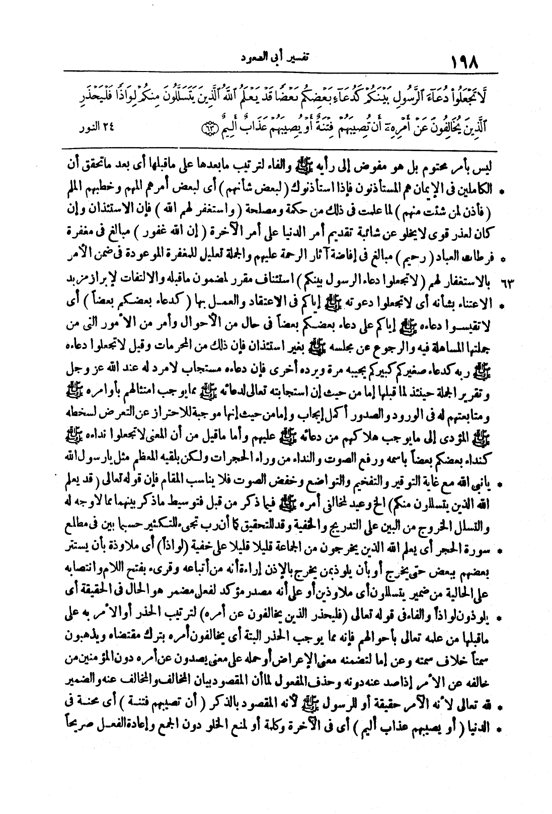سورة النور 63 ليس بأمرٍ محتومٍ بل هو مفوَّض إلى رأيِه صلى الله عليه وسلم والفاءُ لترتيب ما بعدها على ما قبلها أي بعد ما تحقَّق أنَّ الكاملين في الإيمان هم المستأذنُون فإذا استأذنوك {لِبَعْضِ شَأْنِهِمْ} أي لبعضِ أمرِهم المهم وخَطبهم المُلِّمِ {فَأْذَن لّمَن شِئْتَ مِنْهُمْ} لما علمتَ في ذلك من حكمةٍ ومصلحةٍ {واستغفر لَهُمُ الله} فإنَّ الاستئذانَ وإنْ كان لعذرٍ قويَ لا يخلُو عن شائبةِ تقديمِ أمرِ الدُّنيا على أمرِ الآخرةِ {أَنَّ الله غَفُورٌ} مبالِغٌ في مغفرةِ فرطاتِ العبادِ {رَّحِيمٌ} مبالِغٌ في إفاضةِ آثار الرَّحمةِ عليهم والجملةُ تعليلٌ للمغفرة الموعودةِ في ضمن الأمرِ بالاستغفار لهم
