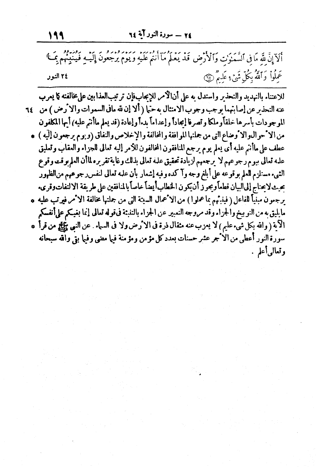 سورة النور 64 للاعتناء بالتَّهديد والتَّحذيرِ واستُدل به على أنَّ الأمرَ للإيجاب فإنَّ ترتيب العذابينِ على مخالفته كما يُعرب عنه التَّحذيرُ عن إصابتهما يوجبُ وجوبَ الامتثالِ به حتماً