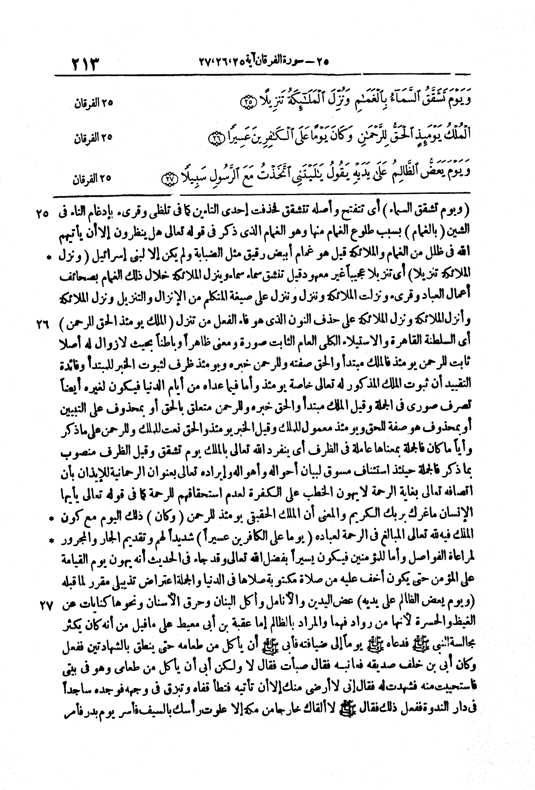 {وَيَوْمَ تَشَقَّقُ السماء} أي تتفتحُ وأصلُه تتشقَّقُ فحُذفتْ إحدى التَّاءينِ كما في تلظى وقرئ بإدغامِ التَّاءِ في الشِّينِ {بالغمام} بسببِ طلوعِ الغمامِ منها وهو الغَمامُ الذي ذُكر في قوله تعالى هَلْ يَنظُرُونَ إِلاَّ أَن يَأْتِيَهُمُ الله فِي ظُلَلٍ مّنَ الغمام والملائكة قيل هو غمامٌ أبيضُ رقيقٌ مثل الضبابة لم يكُنْ إلاَّ لبني إسرائيلَ {وَنُزّلَ الملائكة تَنزِيلاً} أي تنزيلاً عجيباً غيرَ معُهودٍ قيل تنشق سماءً سماءً وينزل الملائكةُ خلالَ ذلك الغمامِ بصحائفِ أعمالِ العبادِ وقرئ ونزلت الملائكة وننزيل وتنزل على صيغة المتكلم من الإنزالِ والتَّنزيل ونزَّل الملائكةَ وأنزل الملائكة ونزل الملائكةُ على حذف النُّون الذي هو فاءُ الفعلِ من تنزل