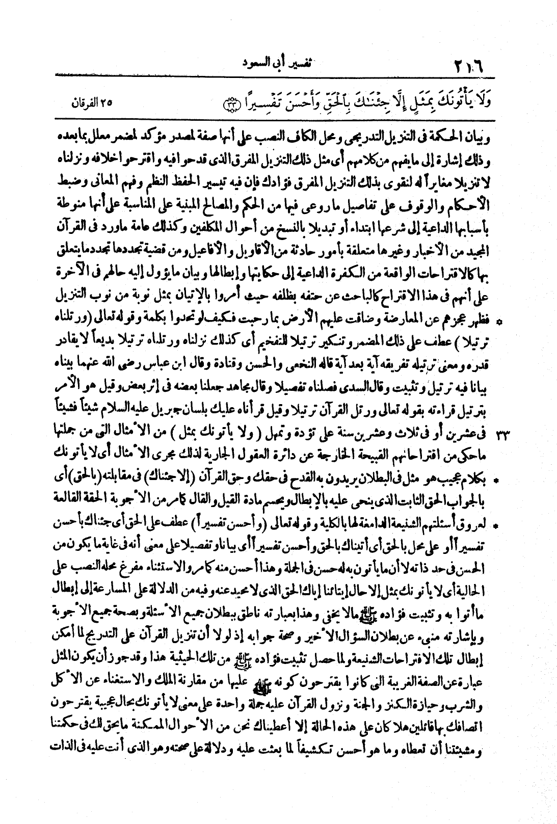 {وَلاَ يَأْتُونَكَ بِمَثَلٍ} من الأمثال من جملتها ما حكي من اقتراحاتِهم القبيحةِ الخارجةِ عن دائرةِ العقولِ الجاريةِ لذلك مجرى الأمثالِ أي لا يأتونَك بكلامٍ عجيبٍ هو مَثَلٌ في البُطلان يريدون به القَدْحَ في حقِّك وحقِّ القُرآنِ {إِلاَّ جئناك} في مُقابلتِه {بالحق} أي بالجوابِ الحقِّ الثَّابتِ الذي ينْحي عليه بالإبطالِ ويَحسمُ مادَّةَ القِيلِ والقالِ كما مرَّ من الأجوبةِ الحقَّةِ القالعةِ لعروقِ أسئلتِهم الشَّنيعةِ الدَّامغةِ لها بالكُلِّيةِ وقوله تعالى {وَأَحْسَنَ تَفْسِيراً} عطفٌ على الحقِّ أي جئناك بأحسن الحُسنِ في حدِّ ذاته لا أنَّ ما يأتون به له حَسنٌ في الجملة وهذا أحسنُ منه كما مروا الاستثناء مفرغ محلُّه النصب على الحالية أي لا يأنونك بمثل إلا حال إتياننا إيَّاك الحقَّ الذي لا مجيد عنه وفيه من الدِلالة على المُسارعة إلى إبطالِ ما أتوا به وتثبيت فؤاده صلى الله عليه وسلم مالا يخفى وهذا بعبارته ناطقٌ ببطلان جميع الأسئلة وبصحَّةِ جميع الأجوبة وبإشارته منبىءٌ عن بُطلانِ السُّؤالِ الأخير وصحة جوابة إذلولا أنَّ تنزيلَ القرآن على التَّدريجِ لما أمكن إبطالُ تلك الاقتراحاتِ الشَّنيعةِ ولما حصل تثبيت فؤاده صلى الله عليه وسلم من تلك الحيثيَّةِ هذا وقد جوِّز أنْ يكون المَثَلُ عبارةً عن الصِّفةِ العريبة التي كانُوا يقترحون كونَه صلى الله عليه وسلم عليها من مقارنة الملكِ والاستغناء عن الأكل والشُّربِ وحيازة الكنز والجنَّة ونزول القرآن عليه جملةً واحدةً على معنى لا يأتوك بحال عجيبة يقترحون اتِّصافك بها قائلين هلاَّ كان على هذه الحالة إلا أعطياك نحنُ من الأحوال الممكنة ما يحقُّ لك في حكمتِنا ومشيئتنا أنْ تُعطاهُ وما هو أحسنُ تكشيفاً لما بُعثت عليه ودلالةً على صحَّته وهو الذي أنتَ عليه في الذَّاتِ
