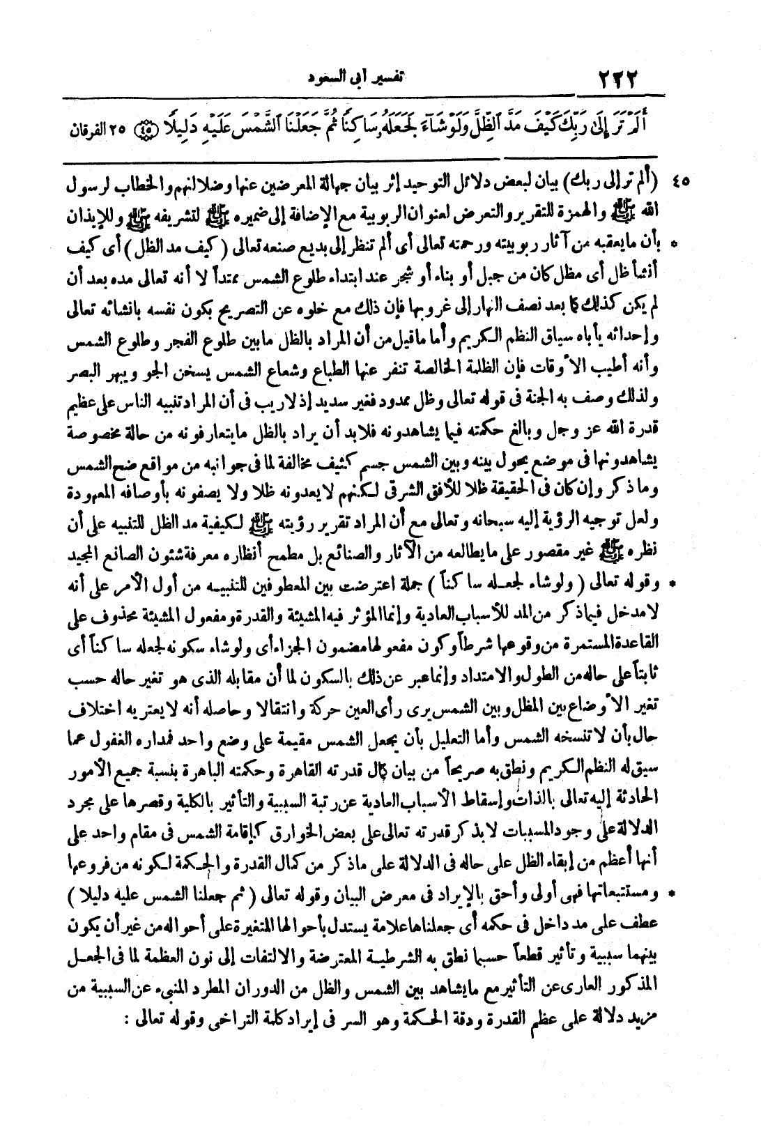 {أَلَمْ تَرَ إلى رَبّكَ} بيانٌ لبعضِ دلائل التَّوحيدِ إثرَ بيانِ جهالةِ المُعرِضينِ عنها وضلالتهم والخطابُ لرسولِ الله صلى الله عليه وسلم والهمزةُ للتَّقريرِ والتَّعرضُ لعُنوان الربوبيةِ مع الإضافة إلى ضميره صلى الله عليه وسلم لتشريفه صلى الله عليه وسلم وللإيذانِ بأنَّ ما يعقُبه من آثارِ ربوبيَّتِه ورحمتِه تعالى أيْ ألمْ تنظرُ إِلَى بديعِ صُنعه تعالى {كَيْفَ مَدَّ الظل} أي كيف أنشأ ظلَّ أيَّ مُظَلَ كان من جبلٍ أو بناء أو شجر عند ابتداء طلوع الشَّمسِ ممتداً لا أنَّه تعالى مدَّهَ بعد أنْ لم يكن كذلك كما بعدَ نصفِ النهار إلى غروبها فإنَّ ذلك مع خُلوِّه عن التَّصريح بكون نفسه بإنشائه تعالى وإحداثِه يأباهُ سياق النظم الكريم وأم ما قيل من أن المرادَ بالظِّل ما بينَ طُلوعِ الفجرِ وطُلوع الشَّمسِ وأنه أطيبُ الأوقاتِ فإنَّ الظُّلمةَ الخالصةَ تنفِرُ عنها الطِّباعُ وشعاع الشمس يسخِّنُ الجوَّ ويبهر البصرَ ولذلك وَصَف به الجَّنةَ في قوله تعالى وَظِلّ مَّمْدُودٍ فغير سديد إذ لاريب في أنَّ المرادَ تنبيهُ النَّاسِ على عظيم قُدرة الله عزَّ وجلَّ وبالغِ حكمتِه فيما يشاهدونَه فلا بدَّ أنْ يُرادُ بالظلِّ ما يتعارفونه من حالةٍ مخصوصةٍ يشاهدونها في موضعٍ يحول بينه وبين الشَّمسِ جسمٌ كثيفٌ مخالفةً لما في جوانبه من مواقعِ ضحِّ الشَّمسِ وما ذُكر وإن كانَ في الحقيقةِ ظلاَّ للأفق الشرقيِّ لكنَّهم لا يعدونه ظلاً ولا يصفونه بأوصافهِ المعهودةِ ولعلَّ توجيه الرُّؤية إليه سبحانه وتعالى مع أنَّ المرادَ تقرير رؤيته صلى الله عليه وسلم لكيفة مدِّ الظِّلِّ للتنبيهِ على أن نظره صلى الله عليه وسلم غير مقصور على ما يُطالعه من الآثارِ والصَّنائعِ بل مطمح أنظارِه معرفةُ شئون الصَّانعِ المجيدِ وقوله تعالى {وَلَوْ شَآء لجعله ساكنا} جملةٌ اعترضتْ بين المعطوفين للتنبيه منْ أولِ الأمرِ عَلى أنَّه لا مدخل فيما ذكر من المدِّ للأسباب العاديَّةِ وإنَّما المؤثر فيه المشيئةُ والقدرةُ ومفعولُ المشيئةِ محذوفٌ على القاعدة المستمرَّة من وقوعها وكونِ مفعولِها مضمونَ الجزاءِ أي ولو شاء سكونَه لجعله ساكناً أي ثابتاً على حالِه من الطُّولِ والامتدادِ وإنما عُبِّر عن ذلك بالسُّكونِ لما أنَّ مقابِلَه الذي هو تغيُّر حاله حسب تغُّيرِ الأوضاعِ بين المضل وبين الشَّمسِ يُرَى رأيَ العينِ حركة وانتقالاً وحاصلُه أنه لا يعتريهِ اختلافُ حالٍ بأن لا تنسخه الشَّمسُ وأمَّا التَّعليلُ بأنْ يجعل الشَّمسَ مقيمةً على وضع واحد فمداره الغفُول عما سيق له النظم الكريم ونطقَ به صريحاً من بيان كمال قُدرته القاهرة وحِكمته الباهرة بنسبة جميعِ الأمور الحادثة إليه تعالى الذات وإسقاط الأسباب العاديَّةِ عن رُتبة السَّببيَّةِ والتَّاثيرِ بالكُلِّيةِ وقصرِها على مجرَّدِ الدِّلالةِ على وجود المسبَّبات لا بذكر قُدرته تعالى على بعض الخوارق كإقامةِ الشَّمسِ في مُقام واحدٍ على أنَّها أعظمُ من إبقاء الظلِّ على حالِه في الدِلالة على ما ذُكر من كمال القُدرةِ والحكمة مكونه من فُروعها ومُستتبعاتها فهي أَوْلَى وأحقُّ بالإيراد في معرضِ البيانِ وقولُه تعالى {ثُمَّ جَعَلْنَا الشمس عَلَيْهِ دَلِيلاً} عطفٌ على مدَّ داخلٌ في حُكمهِ أيْ جعلناها علامةً يستدلُّ بأحوالها المتغيِّرة على أحوالِه من غير أنْ يكونَ بينهما سببيّة وتأثيرٌ قطعاً حسبما نطقَ به الشَّرطيةُ المعترضة والالتفاتُ إلى نونِ العظمةِ لما في الجعلِ المذكورِ العاري عن التَّأثيرِ مع ما يشاهد بين الشَّمسِ والظلِّ من الدَّورانِ المُطَّردِ المنبىءِ عن السَّببيّةِ من مزيد دلالة على عظمِ القُدرةِ ودقة الحكمةِ وهو السرُّ في إيراد كلمة التَّراخي وقولُه تعالى {ثُمَّ قبضناه}