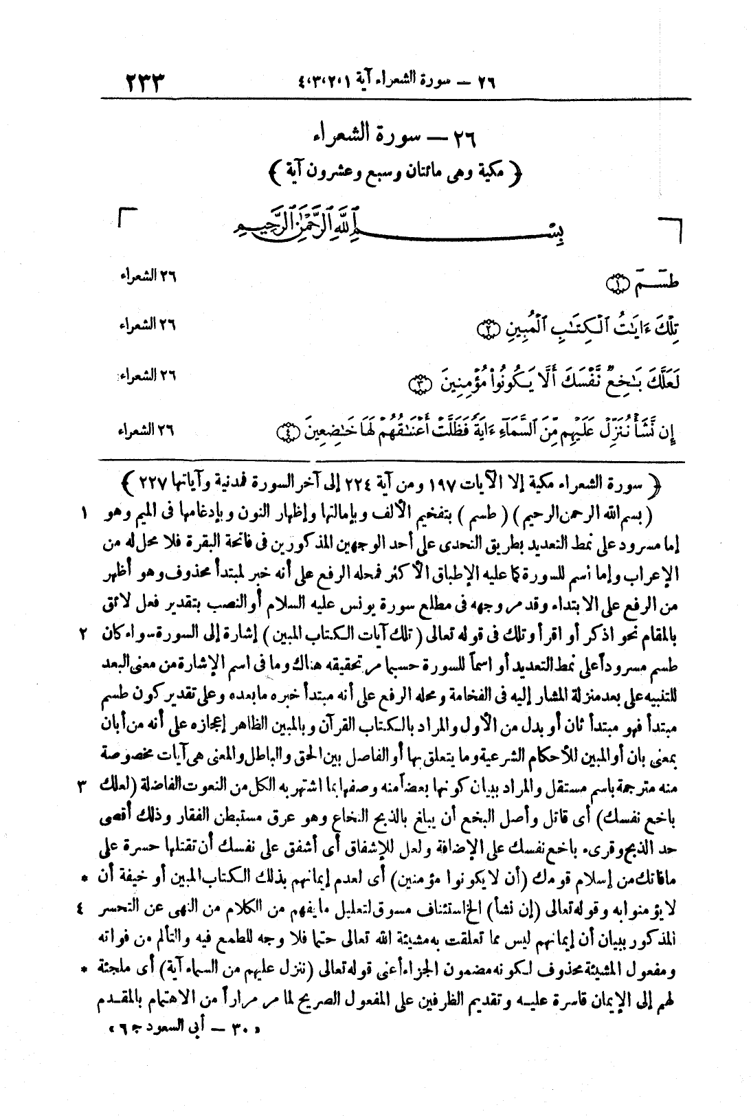 سورة الشعراء مكية إلا الآيات 197 ومن آية 224 إلى آخر السورة فمدنية وآياتها 227