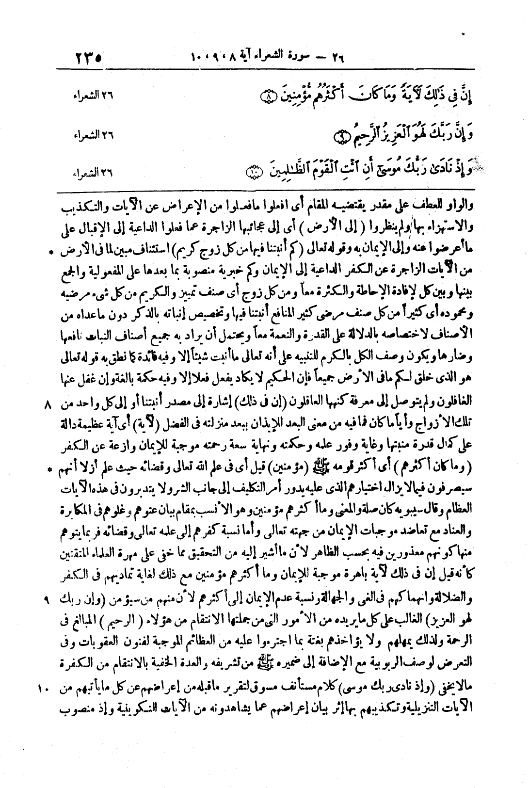 {إِنَّ فِى ذَلِكَ} إشارةٌ إلى مصدرِ أنبتنا أو إلى كلُّ واحدٍ من تلك الأزواجٍ وأيَّا ما كان فما فيه من معنى البعد للإبذان ببُعدِ منزلتِهِ في الفضلِ {الآية} أي آيةً عظيمةً دالَّةً على كمالِ قُدرةِ مُنبتها وغايةِ وفُورِ علمهِ وحكمتِه ونهايةِ سعَةِ رحمتِه موجبةً للإيمانِ وازعةً عن الكُفرِ {وَمَا كَانَ أَكْثَرُهُمْ} أي أكثر قومه صلى الله عليه وسلم {مُّؤْمِنِينَ} قيل أي في علم الله تعالى وقضائِه حيثُ علم أزلاً أنَّهم سيُصرفون فيما لا يزالُ اختيارُهم الذي عليه يدورُ أمرُ التَّكليفِ إلى جانب الشَّرِّ ولا يتدبَّرون في هذه الآياتِ العظامِ وقال سيبويِه كانَ صلةٌ والمعنى وما أكثرُهم مؤمنين وهو الأنسبُ بمقامِ بيانِ عُتوِّهم وغُلوِّهم في المكابرةِ والعنادِ مع تعاضد موجبات الإيمان من جهتِه تعالى وأما نسبةُ كفرِهم إلى علمهِ تعالى وقضائِه فرُبَّما يتُوهَّم منها كونُهم معذورينَ فيه بحسبِ الظَّاهرِ لأنَّ ما أُشير إليهِ من التَّحقيقِ ممَّا خفيَ على مَهَرةِ العُلماء المُتقنين كأنَّه قيل إِنَّ فِى ذَلِكَ لأَيَةً باهرةً موجبةً للإيمانِ وما أكثرُهم مُؤمنين مع ذلكَ لغايةِ تمادِيهم في الكُفرِ والضلالة وانهاكهم في المعنى والجَهَالةِ ونسبةُ عدمِ الإيمانِ إلى أكثرِهم لأنَّ منهم مَن سُيؤمن