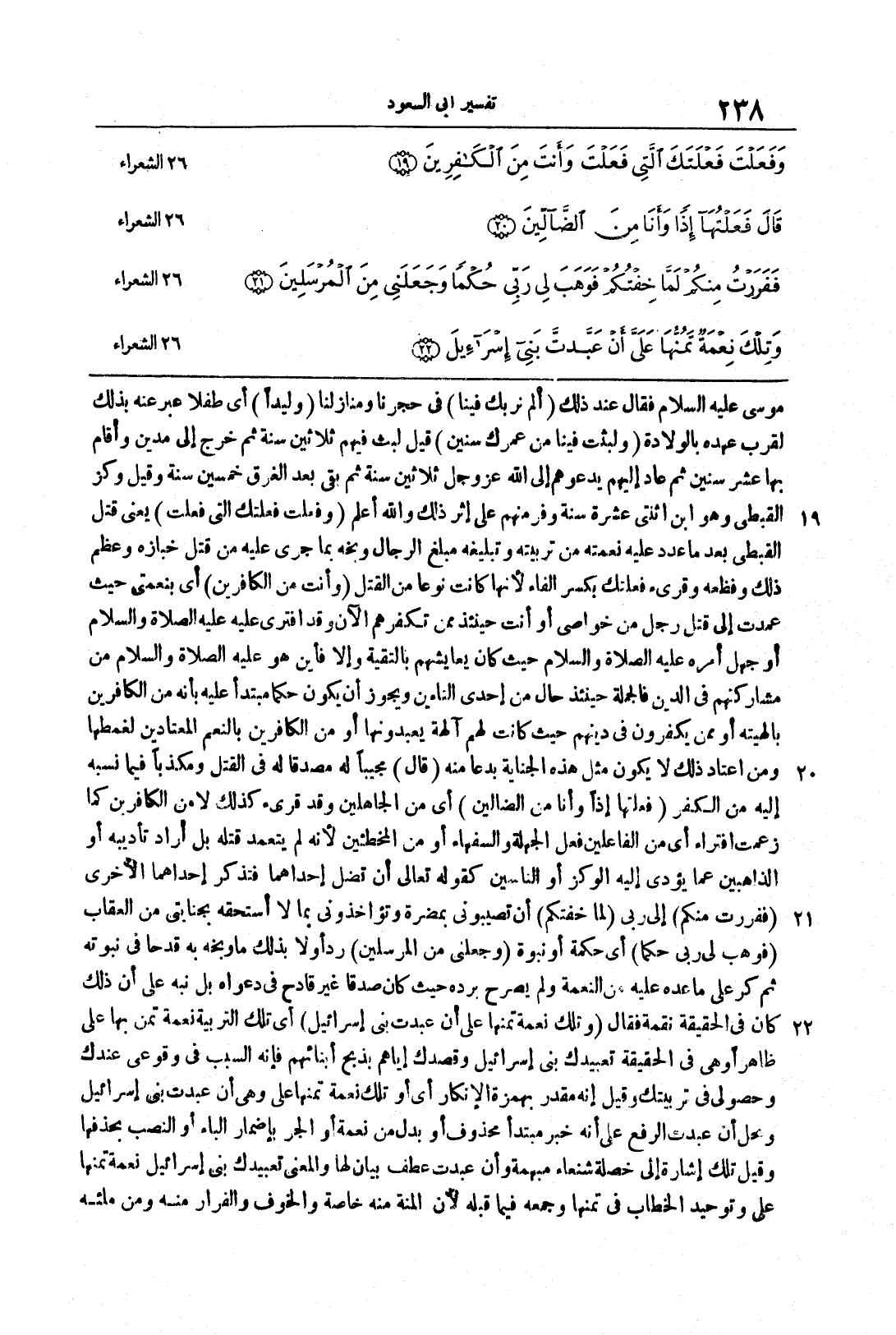 سورة الشعراء (19 22) مُوسى عليه السَّلامُ فقال عند ذلك {أَلَمْ نُرَبّكَ فِينَا} في حِجرِنا ومنازلِنا {وَلِيداً} أي طِفلاً عبر عنه بذلك لقُرب عهده بالولادة {وَلَبِثْتَ فِينَا مِنْ عُمُرِكَ سِنِينَ} قيل لبثَ فيهم ثلاثين سنةً ثم خرجَ إلى مدينَ وأقام بها عشرَ سنين ثمَّ عاد إليهم يدعُوهم إلى الله عزَّ وجلَّ ثلاثينَ سنة ثم بقي بعدَ الغرقِ خمسينَ سنة وقيل وكز القبطيَّ وهو ابنُ اثنتي عشرةَ سنة وفرَّ منهم على أثرِ ذلك والله أعلم