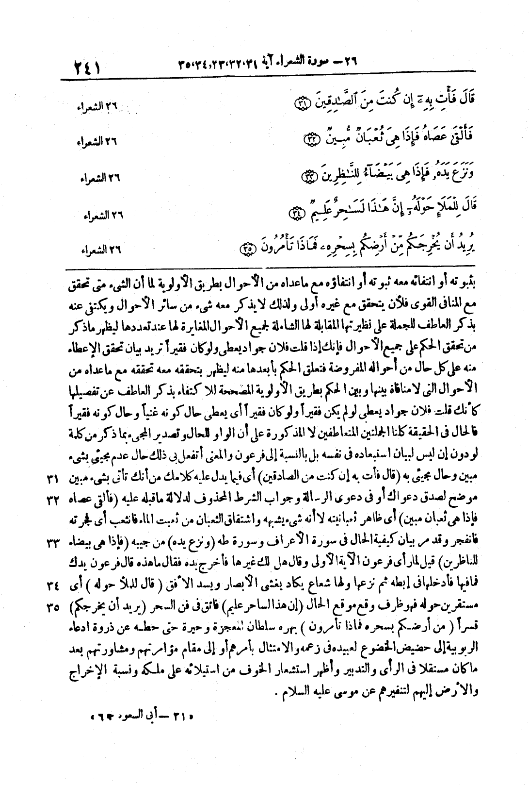 بثبوته أو انتفائِه معه ثبوتُه أو انتفاؤُه مع ما عداه من الأحوال بطريق الأولوية لما أن الشيءَ متى تحقق مع المنافي القويَّ فلأنْ يتحقَّقَ مع غيره أولى لذلك لا يُذكرُ معه شيءٌ من سائر الأحوال ويكتفى عنه بذكر العاطف للجُملة على نظيرتها المقابلةِ لها الشاءلة لجميع الأحوالِ المغايرةِ لها عند تعدُّدها ليظهر ما ذكر من تحقُّق الحكم على جميع الأحوال فإنَّك إذا قلتَ فلانٌ جوادٌ يُعطي ولو كان فقيرا تريد بيان تحقق الإعطاء منه على كلِّ حالٍ من أحوالِه المفروضةِ فتعلق الحكم بأبعدِها منه ليظهر بتحقُّقهِ معه تحقُّقه معَ ما عداه من الأحوال التي لا مُنافاة بينها وبينَ الحكم بطريقِ الأولويَّةِ المُصحِّحةِ للاكتفاء بذكرِ العاطفِ عن تفصيلِها كأنَّك قلتَ فلانٌ جوادٌ يُعطي لو لم يكنْ فَقيراً ولو كان فَقيراً أي يُعطى حال كونه غنيا وحال كونِه فقيراً فالحالُ في الحقيقة كلنا الجملتين المتعاطفين لا المذكورةُ على أنَّ الواوُ للحالِ وتصديرُ المجيءِ بما ذُكر من كلمة لَوْ دون أنْ ليس لبيانِ استبعادُه في نفسه بل بالنِّسبة إلى فرعونَ والمعنى أتفعلُ بي ذلك حال عدم مجييء بسيء مبين وحال مجيىء به