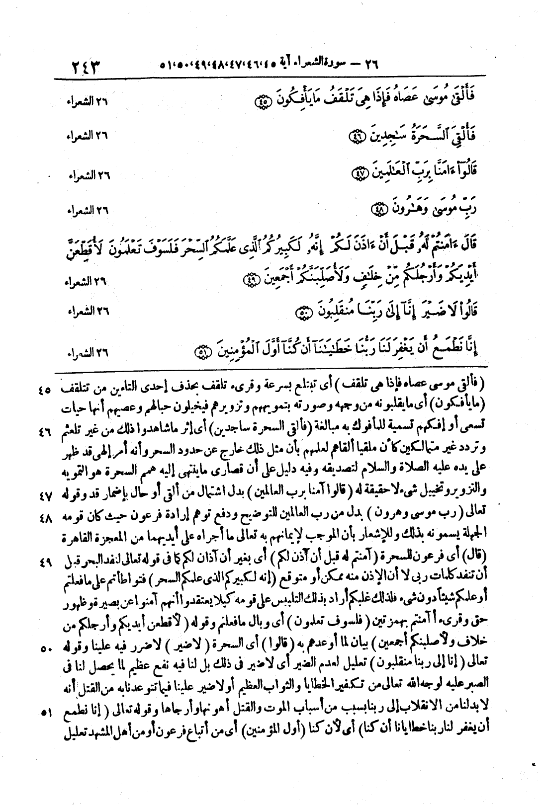 {قال} أي فرعون للسحرة {آمنتم له قبل أن آذن لَكُمْ} أي بغيرِ أنْ آذان لكم كما في قوله تعالى لنقد البحر قَبْلَ أَن تَنفَدَ كلمات رَبّى لا أن الإذنَ منه ممكنٌ أو متوقَّعٌ {إِنَّهُ لَكَبِيرُكُمُ الذى علمكم السحر} فتواطأتم على ما فعلتم أو علَّمكم شيئا دون شيء ولذلك غلبَكم أرادَ بذلك التَّلبيس على قومِه كيلا يعتقدُوا أنَّهم آمنُوا عن بصيرةٍ وظهورِ حقَ وقُرىء أأمنتُم بهمزتينِ {فَلَسَوْفَ تَعْلَمُونَ} أي وبالَ ما فعلتُم وقوله {لاقَطّعَنَّ أَيْدِيَكُمْ وَأَرْجُلَكُمْ مّنْ خِلاَفٍ وَلاَصَلّبَنَّكُمْ أَجْمَعِينَ} بيانٌ لما أو عدهم به