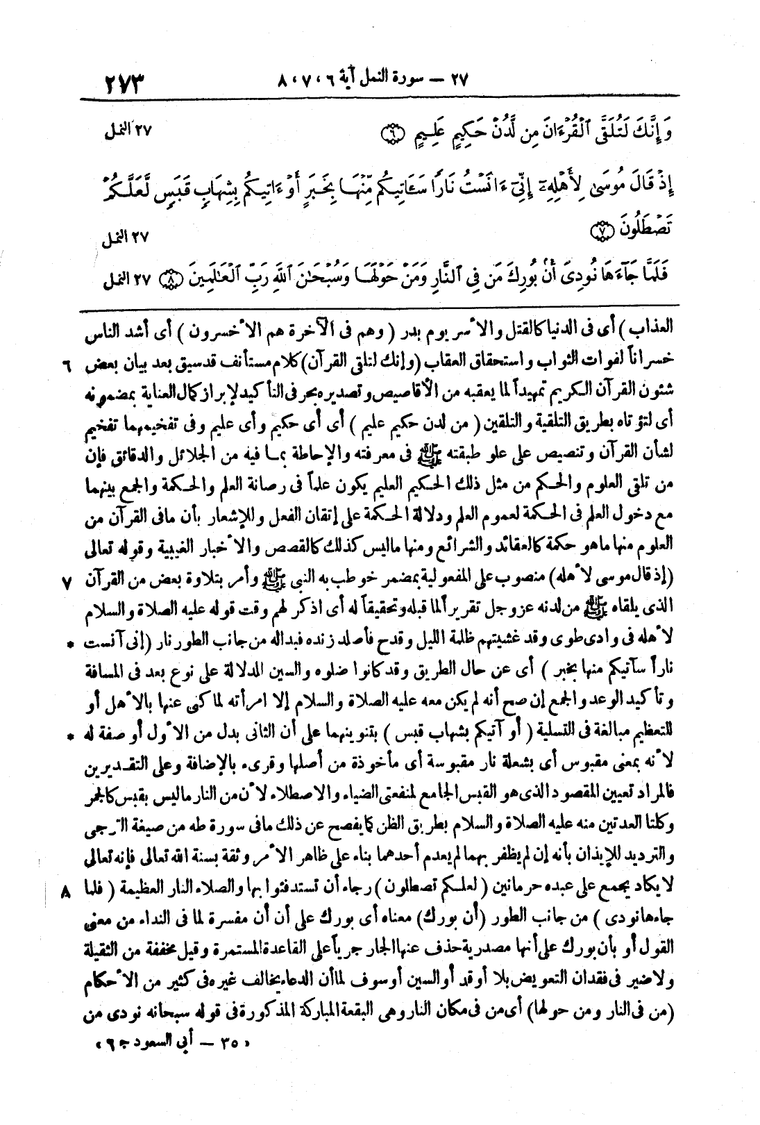 {إِذْ قَالَ موسى لأَهْلِهِ} منصوبٌ على المفعوليةِ بمضمرِ خوطب به النبيُّ صلَّى الله عليهِ وسلم وأُمر بتلاوةِ بعضٍ من القرآن الذي يلقاه صلى الله عليه وسلم من لَدْنه عزَّ وجلَّ تقريراً لما قبله وتحقيقاً له أي أذكُر لهم وقت قوله عليه الصلاة والسَّلامُ لأهلِه في وادي طوى وقد غشيتُهم ظلمةُ اللَّيلِ وقدَح فأصلَدَ زنده فبدا له من جانب الطور نار {إِنّى آنَسْتُ نَاراً سَآتِيكُمْ مِّنْهَا بِخَبَرٍ} أي عن حال الطَّريقِ وقد كانوا ضلوه والسين الدلالة على نوعِ بُعدٍ في المسافةِ وتأكيد الوعد والجمع إنْ صحَّ أنَّه لم يكن معَهُ عليهِ الصَّلاةُ والسَّلامُ إال امرأتُه لما كنى عنها بالأهلِ أو للتَّعظيمِ مبالغةً في التَّسليةِ {أَوْ آتِيكُمْ بِشِهَابٍ قَبَسٍ} بتنوينهما على أن الثَّاني بدلٌ من الأَوَّلِ أو صفة له لأنَّه بمعنى مقبوسٍ أي بشعلة نارٍ مقبوسةٍ أي مأخوذه من أصلها وقرئ بالإضافةِ وعلى التَّقديرينِ فالمرادُ تعيينُ المقصودِ الذي هو القَبس الجامعُ لمنفعتي الضِّياءِ والاصطلاءِ لأنَّ من النَّار ما ليس بقبسٍ كالجمرِ وكلتا العُدَّتينِ منه عليه الصَّلاةُ والسَّلامُ بطريق الظنِّ كما يفصحُ عن ذلك ما في سورةِ طه من صيغة التَّرجى والتَّرديدُ للإيذانِ بأنَّه إن لم يظفرْ بهما لم يعدم أحدهما بناءً على ظاهرِ الأمرِ وثقةً بسُنَّةِ الله تعالى فإنَّه تعالى لا يكادُ يجمع على عبده حرمانينِ {لَّعَلَّكُمْ تَصْطَلُونَ} رجاءَ أنْ تستدفئوا بها والصِّلاءُ النَّارُ العظيمةُ